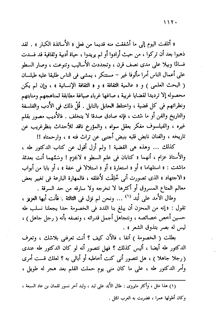 بطلت (الخصومة) آنفا، فالآن كيف؟ أنت تعرفني بلا شك، وتعرف الدكتور طه أيضا، أليس كذلك؟ فهل تتصور أنه لو كان الدكتور طه عندي (رجلا جاهلا)، هل تتصور أنى كنت أخاطبه أو أبالى به؟ لعلك قست أمرى وأمر الدكتور طه، على ما كان مني يوم حملت القلم بعد هجر له طويل،