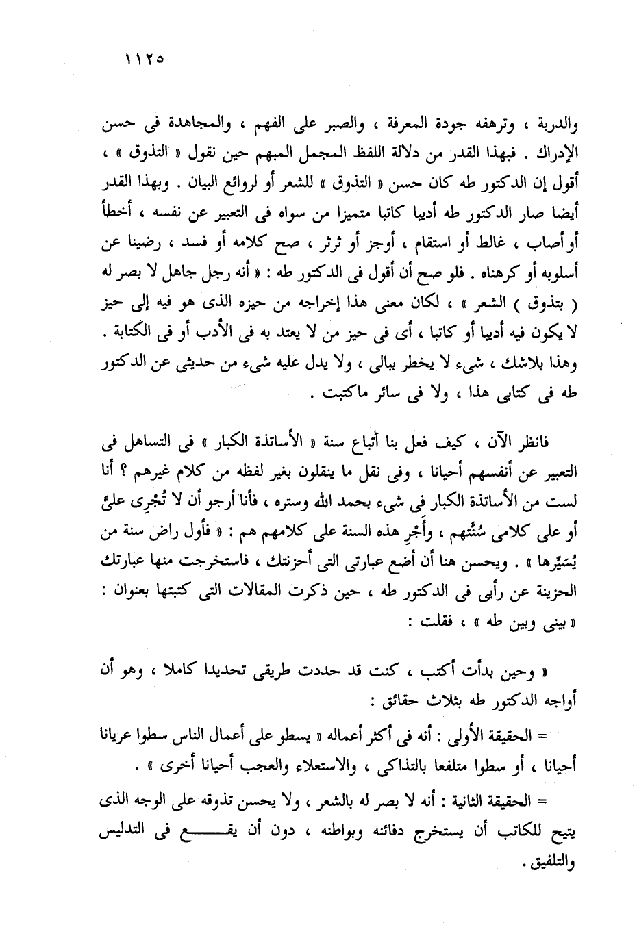 فانظر الآن، كيف فعل بنا أتباع سنة "الأساتذة الكبار" في التساهل في التعبير عن أنفسهم أحيانا، وفي نقل ما ينقلون بغير لفظه من كلام غيرهم؟ أنا لست من الأساتذة الكبار في شيء بحمد الله وستره، فأنا أرجو أن لا تُجْرِى عليَّ أو على كلامي سُنَّتهم، وأَجْرِ هذه السنة على كلامهم هم: "فأول راض سنة من يُسَيِّرها". ويحسن هنا أن أضع عبارتى التي أحزنتك، فاستخرجت منها عبارتك الحزينة عن رأيي في الدكتور طه، حين ذكرت المقالات التي كتبتها بعنوان: "بيني وبين طه"، فقلت: