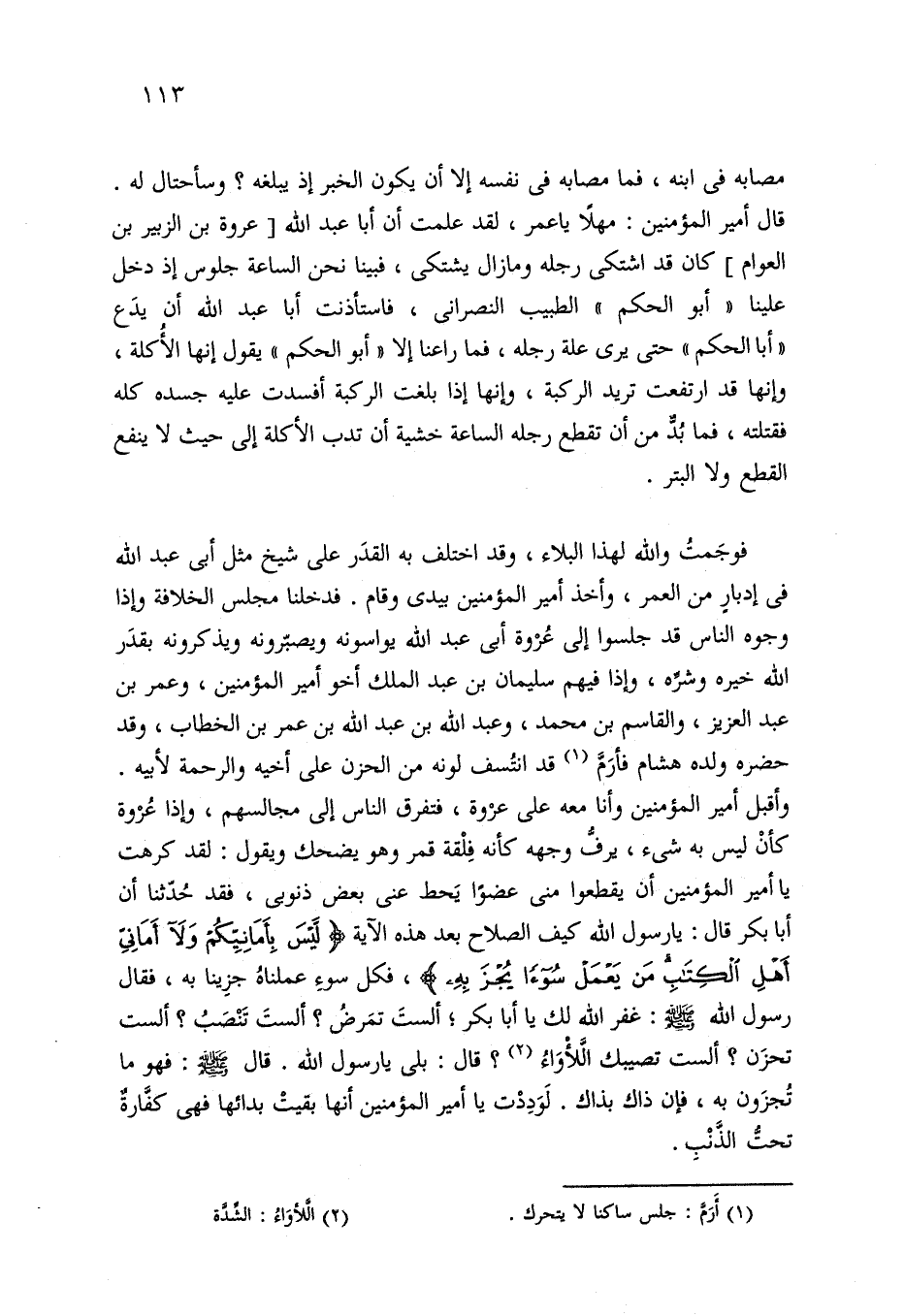 مصابه في ابنه، فما مصابه في نفسه إلا أن يكون الخبر إذ يبلغه؟ وسأحتال له. قال أمير المؤمنين: مهلًا يا عمر، لقد علمت أن أبا عبد الله [عروة بن الزبير بن العوام] كان قد اشتكى رجله وما زال يشتكي، فبينا نحن الساعة جلوس إذ دخل علينا "أبو الحكم" الطبيب النصراني، فاستأذنت أبا عبد الله أن يدَع "أبا الحكم" حتى يرى علة رجله، فما راعنا إلا "أبو الحكم" يقول إنها الأُكلة، وإنها قد ارتفعت تريد الركبة، وإنها إذا بلغت الركبة أفسدت عليه جسده كله فقتلته، فما بُدٌّ من أن تقطع رجله الساعة خشية أن تدب الأكلة إلى حيث لا ينفع القطع ولا البتر.