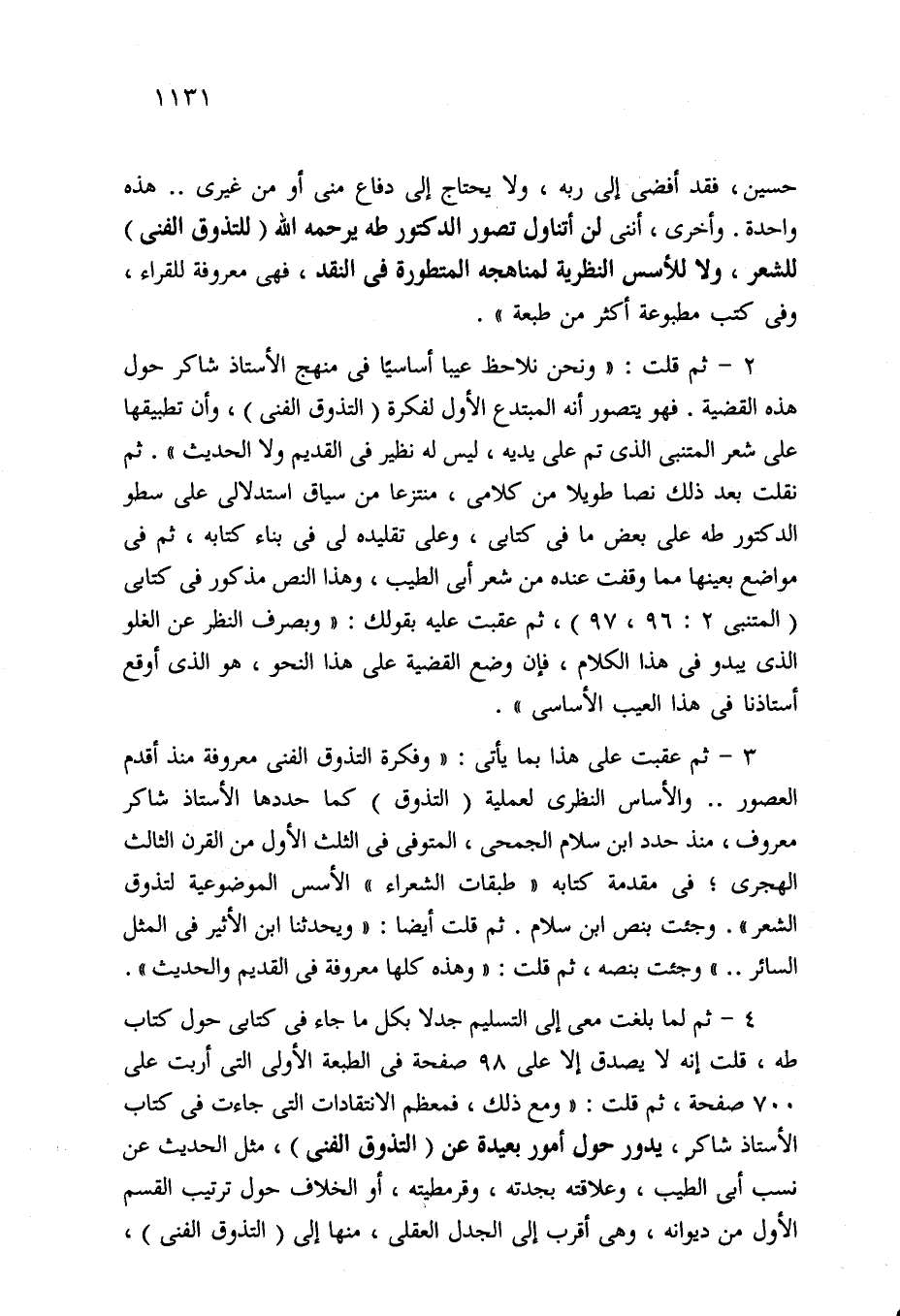 4 - ثم لما بلغت معى إلى التسليم جدلا بكل ما جاء في كتابي حول كتاب طه، قلت إنه لا يصدق إلا على 98 صفحة في الطبعة الأولى التي أربت على 700 صفحة، ثم قلت: "ومع ذلك، فمعظم الانتقادات التي جاءت في كتاب الأستاذ شاكر، يدور حول أمور بعيدة عن (التذوق الفني)، مثل الحديث عن نسب أبي الطيب، وعلاقته بجدته، وقرمطيته، أو الخلاف حول ترتيب القسم الأول من ديوانه، وهي أقرب إلى الجدل العقلي، منها إلى (التذوق الفني)،