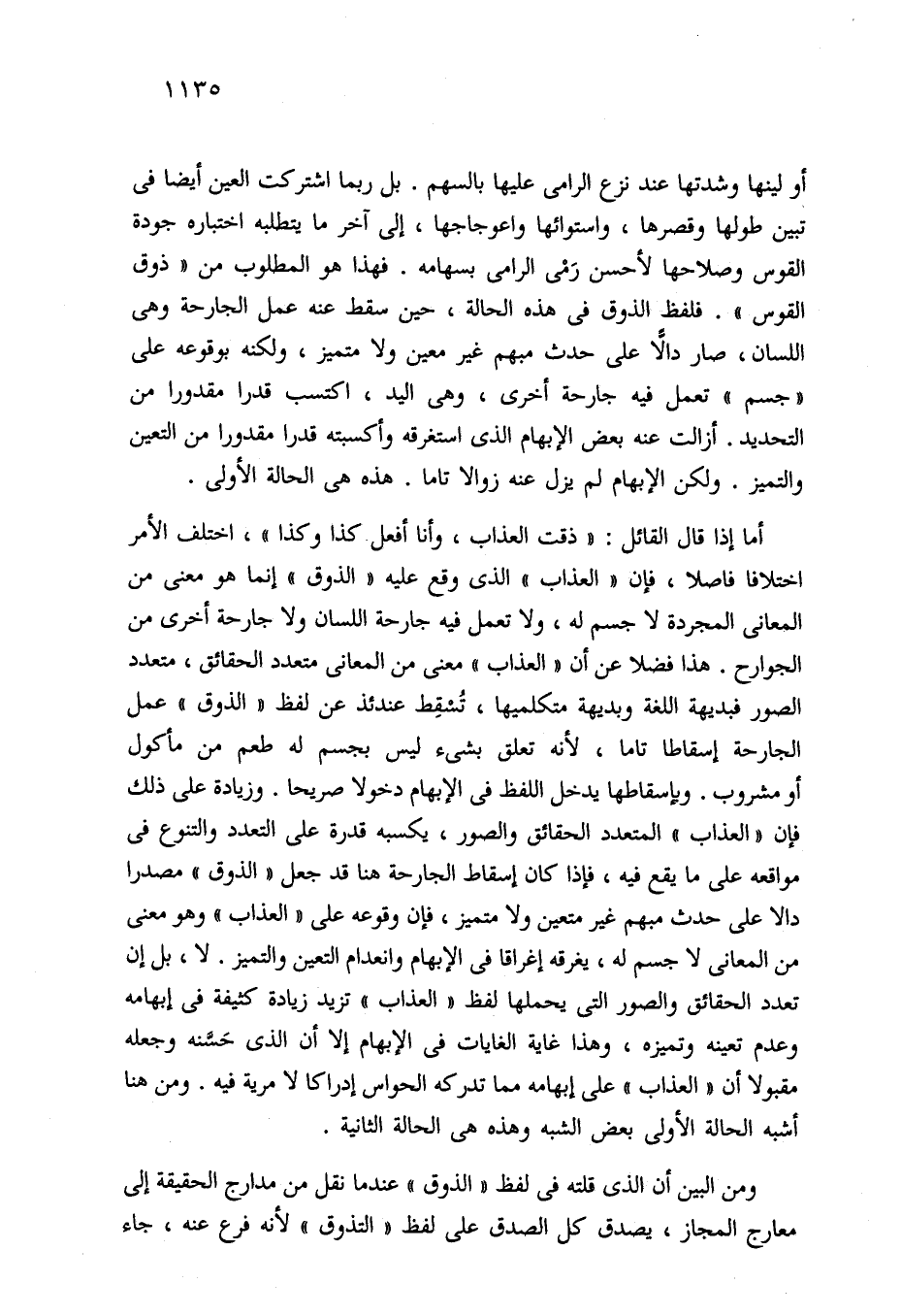 أو لينها وشدتها عند نزع الرامى عليها بالسهم. بل ربما اشتركت العين أيضا في تبين طولها وقصرها، واستوائها واعوجاجها، إلى آخر ما يتطلبه اختباره جودة القوس وصلاحها لأحسن رَمْى الرامى بسهامه. فهذا هو المطلوب من "ذوق القوس". فلفظ الذوق في هذه الحالة، حين سقط عنه عمل الجارحة وهي اللسان، صار دالاًّ على حدث مبهم غير معين ولا متميز، ولكنه بوقوعه على "جسم" تعمل فيه جارحة أخرى، وهي اليد، اكتسب قدرا مقدورا من التحديد. أزالت عنه بعض الإبهام الذي أستغرقه وأكسبته قدرا مقدورا من التعين والتميز. ولكن الإبهام لم يزل عنه زوالا تاما. هذه هي الحالة الأولى.