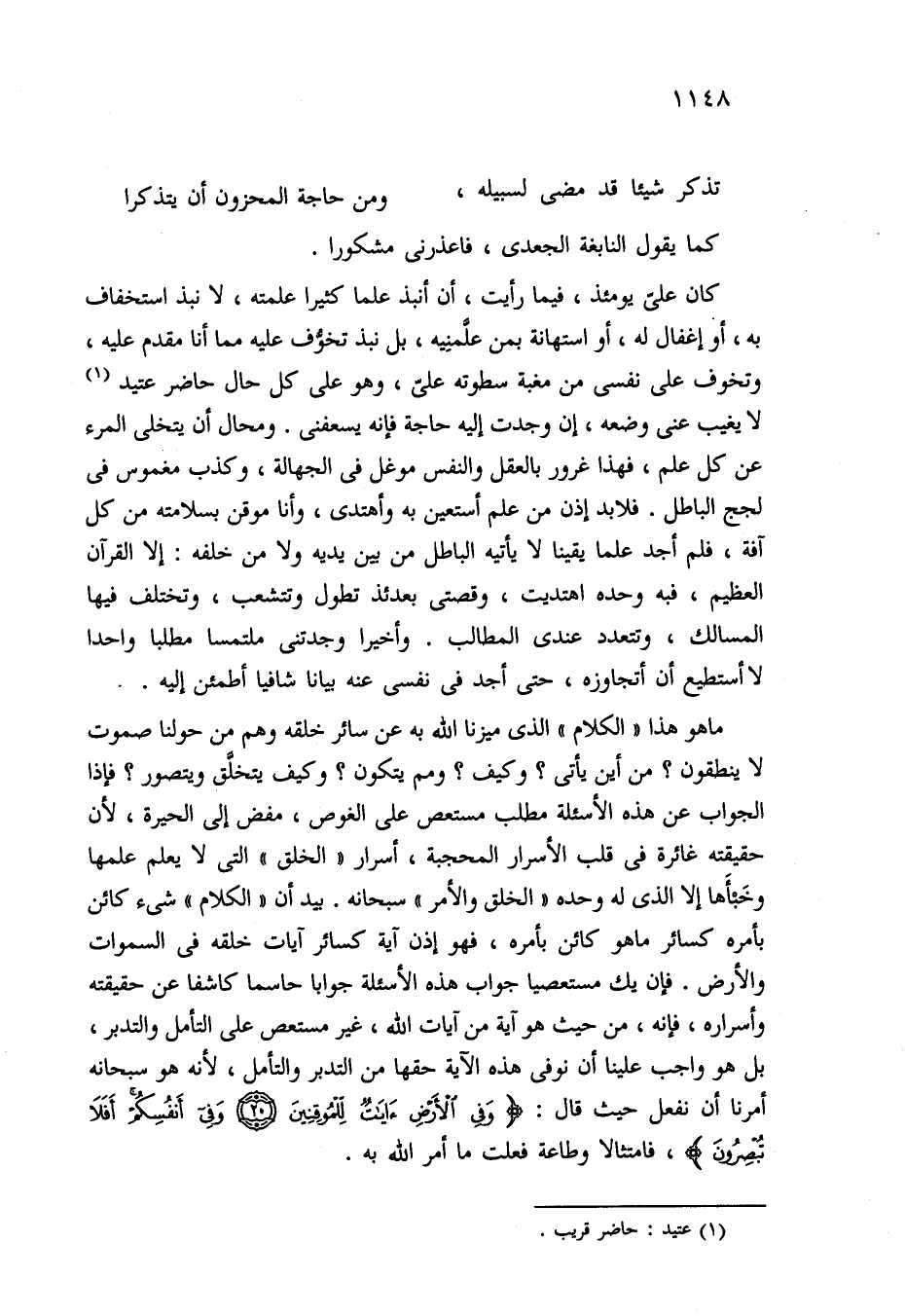 كان عليّ يومئذ، فيما رأيت، أن أنبذ علما كثيرا علمته، لا نبذ استخفاف به، أو إغفال له، أو استهانة بمن علَّمنيه، بل نبذ تخوُّف عليه مما أنا مقدم عليه، وتخوف على نفسي من مغبة سطوته عليّ، وهو على كل حال حاضر عتيد (¬1) لا يغيب عني وضعه، إن وجدت إليه حاجة فإنه يسعفني. ومحال أن يتخلى المرء عن كل علم، فهذا غرور بالعقل والنفس موغل في الجهالة، وكذب مغموس في لجج الباطل. فلابد إذن من علم أستعين به وأهتدى، وأنا موقن بسلامته من كل آفة، فلم أجد علما يقينا لا يأتيه الباطل من بين يديه ولا من خلفه: إلا القرآن العظيم، فبه وحده اهتديت، وقصتى بعدئذ تطول وتتشعب، وتختلف فيها المسالك، وتتعدد عندي المطالب. وأخيرا وجدتنى ملتمسا مطلبا واحدا لا أستطيع أن أتجاوزه، حتى أجد في نفسي عنه بيانا شافيا أطمئن إليه. .