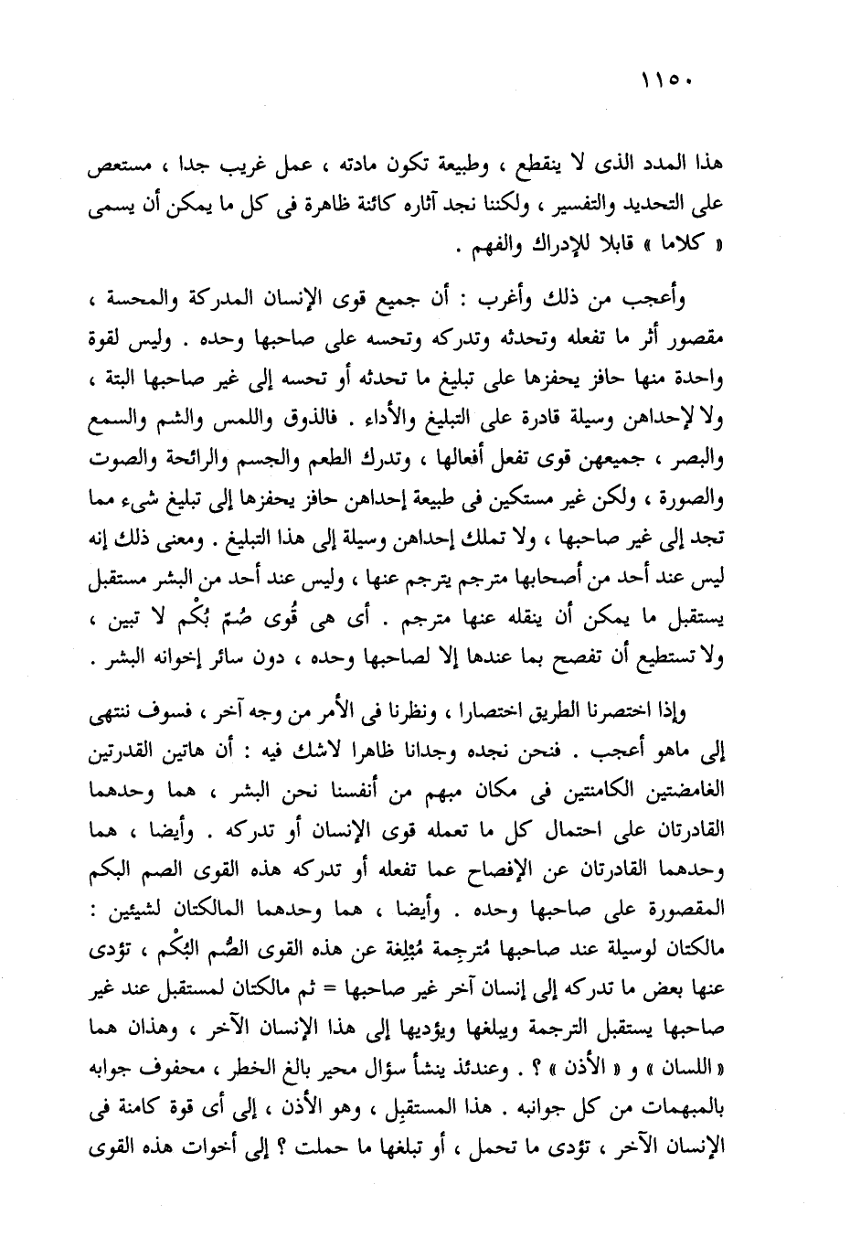 وأعجب من ذلك وأغرب: أن جميع قوى الإنسان المدركة والمحسة، مقصور أثر ما تفعله وتحدثه وتدركه وتحسه على صاحبها وحده. وليس لقوة واحدة منها حافز يحفزها على تبليغ ما تحدثه أو تحسه إلى غير صاحبها البتة، ولا لإحداهن وسيلة قادرة على التبليغ والأداء. فالذوق واللمس والشم والسمع والبصر، جميعهن قوى تفعل أفعالها، وتدرك الطعم والجسم والرائحة والصوت والصورة، ولكن غير مستكين في طبيعة إحداهن حافز يحفزها إلى تبليغ شيء مما تجد إلى غير صاحبها، ولا تملك إحداهن وسيلة إلى هذا التبليغ. ومعنى ذلك إنه ليس عند أحد من أصحابها مترجم يترجم عنها، وليس عند أحد من البشر مستقبل يستقبل ما يمكن أن ينقله عنها مترجم. أي هي قُوى صُمّ بُكْم لا تبين، ولا تستطيع أن تفصح بما عندها إلا لصاحبها وحده، دون سائر إخوانه البشر.