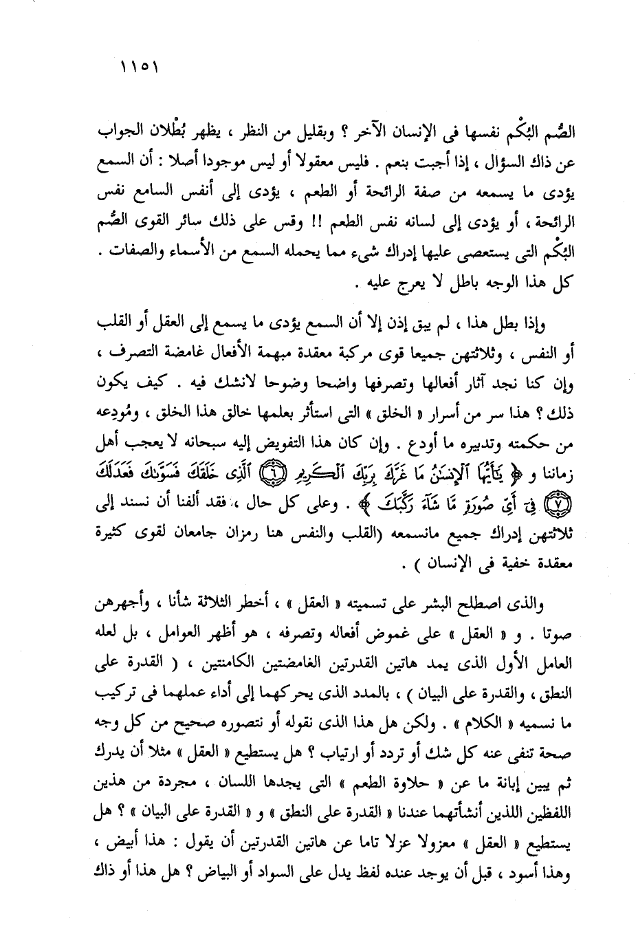 الصُّم البُكْم نفسها في الإنسان الآخر؟ وبقليل من النظر، يظهر بُطْلان الجواب عن ذاك السؤال، إذا أجبت بنعم. فليس معقولا أو ليس موجودا أصلا: أن السمع يؤدى ما يسمعه من صفة الرائحة أو الطعم، يؤدى إلى أنفس السامع نفس الرائحة، أو يؤدى إلى لسانه نفس الطعم! ! وقس على ذلك سائر القوى الصُّم البُكْم التي يستعصى عليها إدراك شيء مما يحمله السمع من الأسماء والصفات. كل هذا الوجه باطل لا يعرج عليه.