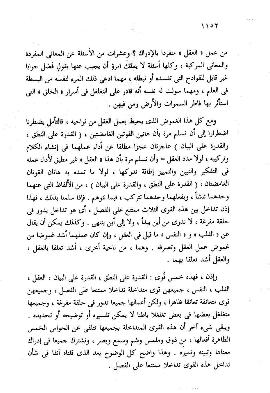 وإذن، فهذه خمس قُوى: القدرة على النطق، القدرة على البيان، العقل، القلب، النفس، جميعهن قوى متداخلة تداخلا ممتنعا على الفصل، وجميعهن قوى متعانقة تعانقا ظاهرا، ولكن أعمالها جميعا تدور في حلقة مفرغة، وجميعها متغلغل بعضها في بعض تغلغلا باطنا لا يمكن تفسيره أو توضيحه أو تحديده. ويبقى شيء آخر أن هذه القوى المتداخلة بجميعها تتلقى عن الحواس الخمس الظاهرة أفعالها، في ذوق وملمس وشم وسمع وبصر، وتشترك جميعا في إدراك معناها وتبينه وتميزه. وهذا واضح كل الوضوح بعد الذي قلناه آنفا في شأن تداخل هذه القوى تداخلا ممتنعا على الفصل.