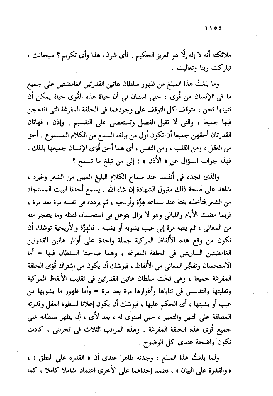ولما بلغتُ هذا المبلغ، وجدته ظاهرا عندي أن "القدرة على النطق"، "والقدرة على البيان"، تعتمد إحداهما على الأخرى اعتمادا شاملا كاملا، كما