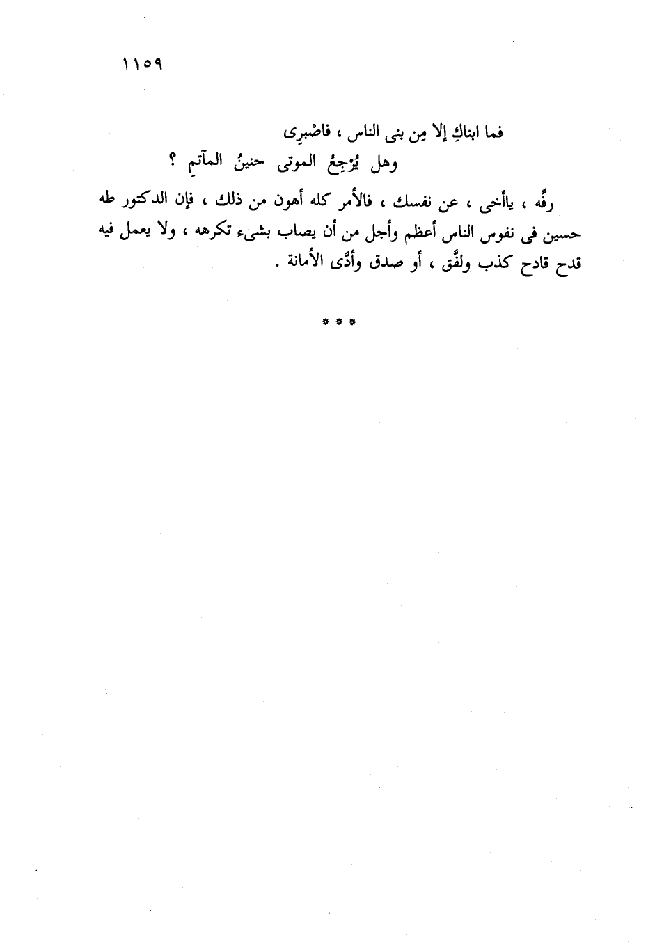 رفِّه، يا أخي، عن نفسك، فالأمر كله أهون من ذلك، فإن الدكتور طه حسين في نفوس الناس أعظم وأجل من أن يصاب بشيء تكرهه، ولا يعمل فيه قدح قادح كذب ولفَّق، أو صدق وأدَّى الأمانة.