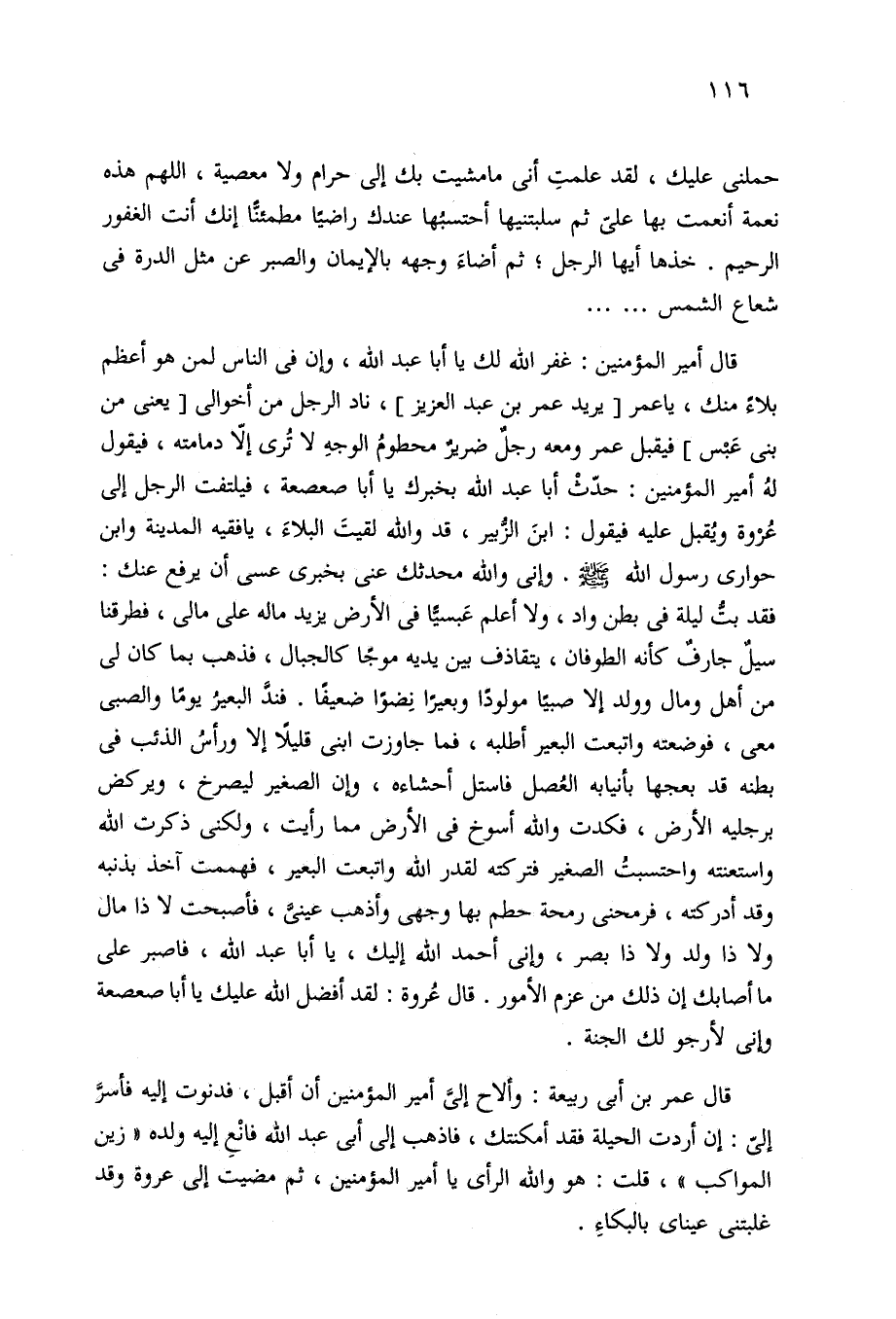 حملني عليك، لقد علمتِ أني ما مشيت بك إلى حرام ولا معصية، اللهم هذه نعمة أنعمت بها عليّ ثم سلبتنيها أحتسبُها عندك راضيًا مطمئنًّا إنك أنت الغفور الرحيم. خذها أيها الرجل؛ ثم أضاءَ وجهه بالإيمان والصبر عن مثل الدرة في شعاع الشمس. . . .