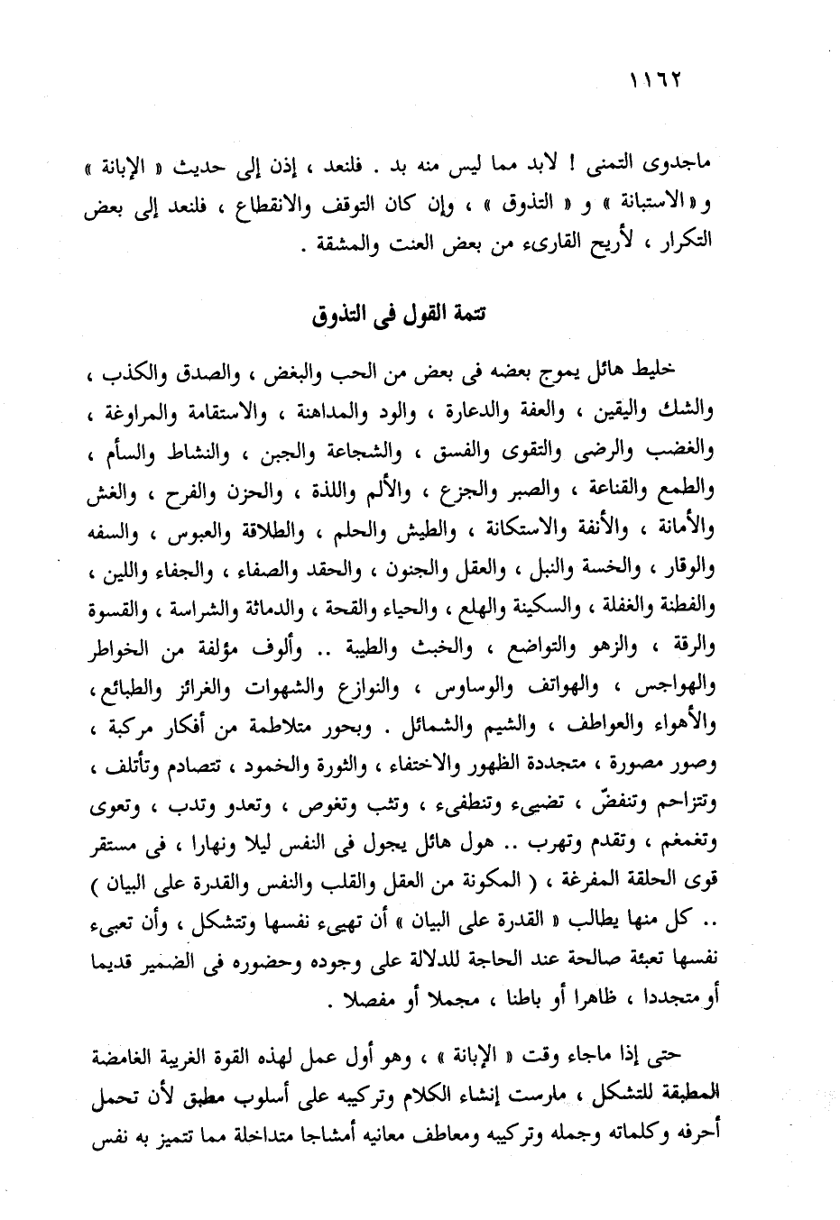 خليط هائل يموج بعضه في بعض من الحب والبغض، والصدق والكذب، والشك واليقين، والعفة والدعارة، والود والمداهنة، والاستقامة والمراوغة، والغضب والرضى والتقوى والفسق، والشجاعة والجبن، والنشاط والسأم، والطمع والقناعة، والصبر والجزع، والألم واللذة، والحزن والفرح، والغش والأمانة، والأنفة والاستكانة، والطيش والحلم، والطلاقة والعبوس، والسفه والوقار، والخسة والنبل، والعقل والجنون، والحقد والصفاء، والجفاء واللين، والفطنة والغفلة، والسكينة والهلع، والحياء والقحة، والدماثة والشراسة، والقسوة والرقة، والزهو والتواضع، والخبث والطيبة .. وألوف مؤلفة من الخواطر والهواجس، والهواتف والوساوس، والنوازع والشهوات والغرائز والطبائع، والأهواء والعواطف، والشيم والشمائل. وبحور متلاطمة من أفكار مركبة، وصور مصورة، متجددة الظهور والاختفاء، والثورة والخمود، تتصادم وتأتلف، وتتزاحم وتنفض، تضيئ وتنطفيء، وتثب وتغوص، وتعدو وتدب، وتعوى وتغمغم، وتقدم وتهرب .. هول هائل يجول في النفس ليلًا ونهارا، في مستقر قوى الحلقة المفرغة، (المكونة من العقل والقلب والنفس والقدرة على البيان) .. كل منها يطالب "القدرة على البيان" أن تهيئ نفسها وتتشكل، وأن تعبئ نفسها تعبئة صالحة عند الحاجة للدلالة على وجوده وحضوره في الضمير قديما أو متجددا، ظاهرا أو باطنا، مجملا أو مفصلًا.