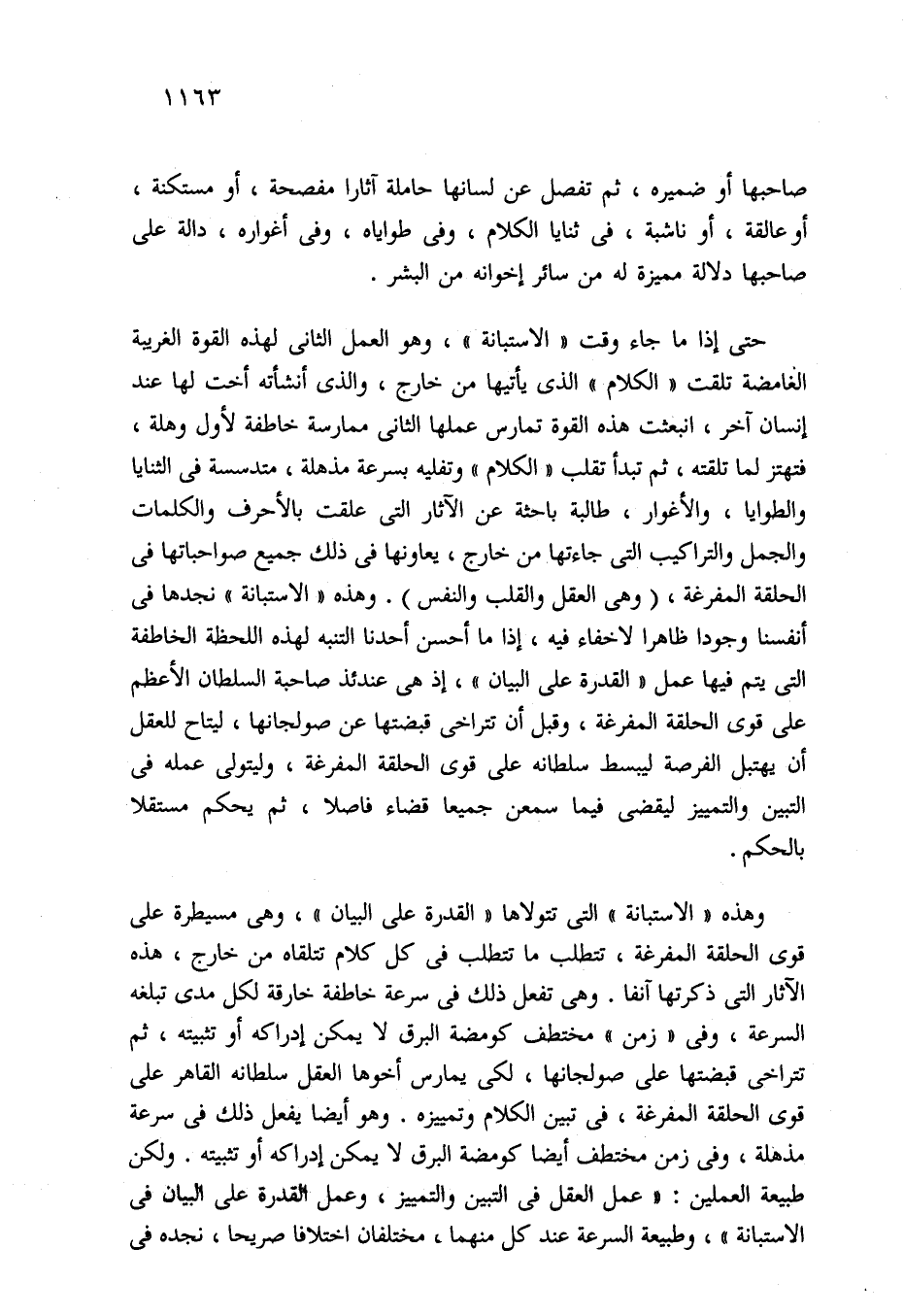وهذه "الاستبانة" التي تتولاها "القدرة على البيان"، وهي مسيطرة على قوى الحلقة المفرغة، تتطلب ما تتطلب في كل كلام تتلقاه من خارج، هذه الآثار التي ذكرتها آنفا. وهي تفعل ذلك في سرعة خاطفة خارقة لكل مدى تبلغه السرعة، وفي "زمن" مختطف كومضة البرق لا يمكن إدراكه أو تثبيته، ثم تتراخى قبضتها على صولجانها، لكي يمارس أخوها العقل سلطانه القاهر على قوى الحلقة المفرغة، في تبين الكلام وتمييزه. وهو أيضًا يفعل ذلك في سرعة مذهلة، وفي زمن مختطف أيضًا كومضة البرق لا يمكن إدراكه أو تثبيته. ولكن طبيعة العملين: "عمل العقل في التبين والتمييز، وعمل القدرة على البيان في الاستبانة"، وطبيعة السرعة عند كل منهما، مختلفان اختلافا صريحا، نجده في