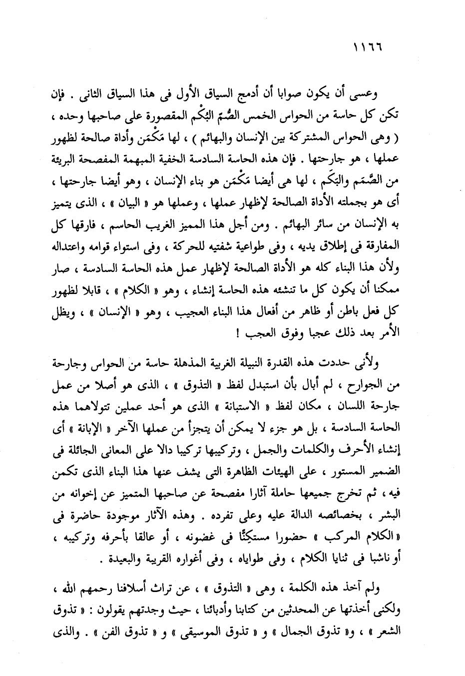 ولأنى حددت هذه القدرة النبيلة الغربية المذهلة حاسة من الحراس وجارحة من الجوارح، لم أبال بأن استبدل لفظ "التذوق"، الذي هو أصلا من عمل جارحة اللسان، مكان لفظ "الاستبانة" الذي هو أحد عملين تتولاهما هذه الحاسة السادسة، بل هو جزء لا يمكن أن يتجزأ من عملها الآخر "الإبانة" أي إنشاء الأحرف والكلمات والجمل، وتركيبها تركيبا دالا على المعاني الجائلة في الضمير المستور، على الهيئات الظاهرة التي يشف عنها هذا البناء الذي تكمن فيه، ثم تخرج جميعها حاملة آثارا مفصحة عن صاحبها المتميز عن إخوانه من البشر، بخصائصه الدالة عليه وعلى تفرده. وهذه الآثار موجودة حاضرة في "الكلام المركب" حضورا مستكِنًا في غضونه، أو عالقا بأحرفه وتركيبه، أو ناشبا في ثنايا الكلام، وفي طواياه، وفي أغواره القريبة والبعيدة.