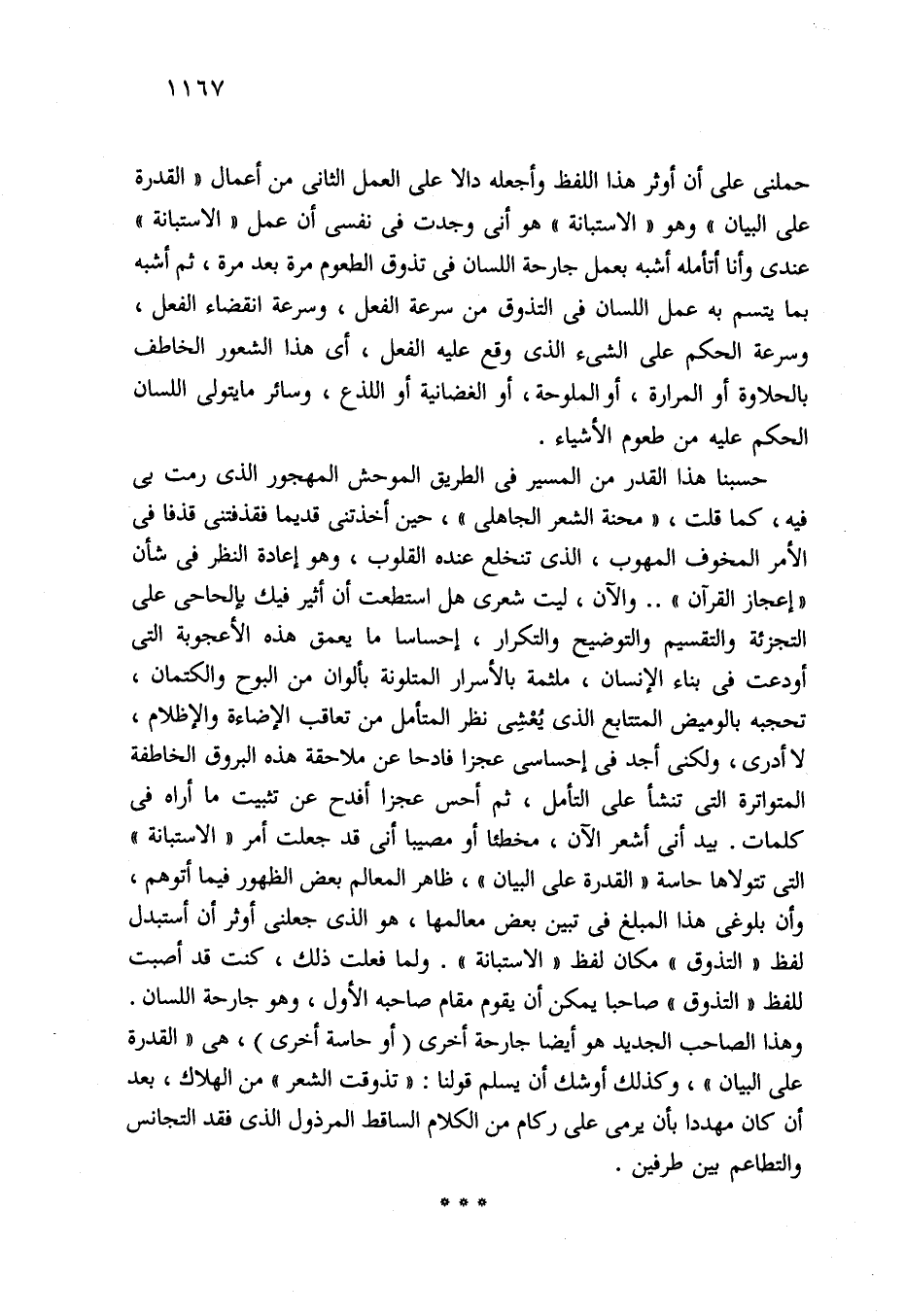 حسبنا هذا القدر من المسير في الطريق الموحش المهجور الذي رمت بي فيه، كما قلت، "محنة الشعر الجاهلي"، حين أخذتني قديما فقذفتنى قذفا في الأمر المخوف المهوب، الذي تنخلع عنده القلوب، وهو إعادة النظر في شأن "إعجاز القرآن" .. والآن، ليت شعرى هل استطعت أن أثير فيك بإلحاحي على التجزئة والتقسيم والتوضيح والتكرار، إحساسا ما يعمق هذه الأعجوبة التي أودعت في بناء الإنسان، ملثمة بالأسرار المتلونة بألوان من البوح والكتمان، تحجبه بالوميض المتتابع الذي يُعْشِى نظر المتأمل من تعاقب الإضاءة والإظلام، لا أدري، ولكني أجد في إحساسى عجزا فادحا عن ملاحقة هذه البروق الخاطفة المتواترة التي تنشأ على التأمل، ثم أحس عجزا أفدح عن تثبيت ما أراه في كلمات. بيد أنى أشعر الآن، مخطئا أو مصيبا أنى قد جعلت أمر "الاستبانة" التي تتولاها حاسة "القدرة على البيان"، ظاهر المعالم بعض الظهور فيما أتوهم، وأن بلوغي هذا المبلغ في تبين بعض معالمها، هو الذي جعلني أوثر أن أستبدل لفظ "التذوق" مكان لفظ "الاستبانة". ولما فعلت ذلك، كنت قد أصبت للفظ "التذوق" صاحبا يمكن أن يقوم مقام صاحبه الأول، وهو جارحة اللسان. وهذا الصاحب الجديد هو أيضًا جارحة أخرى (أو حاسة أخرى)، هي "القدرة على البيان"، وكذلك أوشك أن يسلم قولنا: "تذوقت الشعر" من الهلاك، بعد أن كان مهددا بأن يرمى على ركام من الكلام الساقط المرذول الذي فقد التجانس والتطاعم بين طرفين.