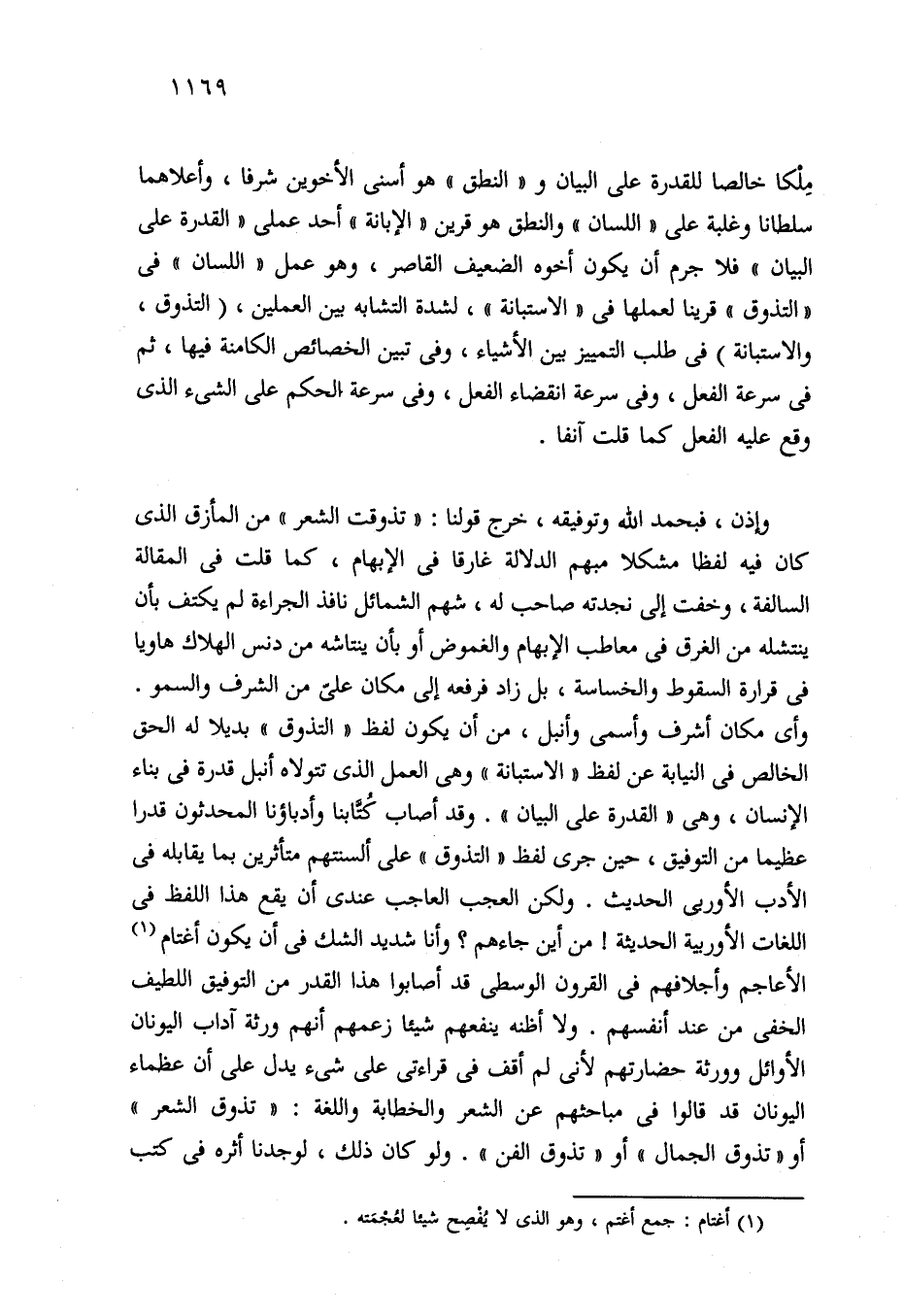 وإذن، فبحمد الله وتوفيقه، خرج قولنا: "تذوقت الشعر" من المأزق الذي كان فيه لفظا مشكلا مبهم الدلالة غارقا في الإبهام، كما قلت في المقالة السالفة، وخفت إلى نجدته صاحب له، شهم الشمائل نافذ الجراءة لم يكتف بأن ينتشله من الغرق في معاطب الإبهام والغموض أو بأن ينتاشه من دنس الهلاك هاويا في قرارة السقوط والخساسة، بل زاد فرفعه إلى مكان على من الشرف والسمو. وأي مكان أشرف وأسمى وأنبل، من أن يكون لفظ "التذوق" بديلا له الحق الخالص في النيابة عن لفظ "الاستبانة" وهي العمل الذي تتولاه أنبل قدرة في بناء الإنسان، وهي "القدرة على البيان". وقد أصاب كُتابنا وأدباؤنا المحدثون قدرا عظيما من التوفيق، حين جرى لفظ "التذوق" على ألسنتهم متأثرين بما يقابله في الأدب الأوربى الحديث. ولكن العجب العاجب عندي أن يقع هذا اللفظ في اللغات الأوربية الحديثة! من أين جاءهم؟ وأنا شديد الشك في أن يكون أغتام (¬1) الأعاجم وأجلافهم في القرون الوسطى قد أصابوا هذا القدر من التوفيق اللطيف الخفي من عند أنفسهم. ولا أظنه ينفعهم شيئًا زعمهم أنهم ورثة آداب اليونان الأوائل وورثة حضارتهم لأنى لم أقف في قراءتى على شيء يدل على أن عظماء اليونان قد قالوا في مباحثهم عن الشعر والخطابة واللغة: "تذوق الشعر" أو "تذوق الجمال" أو "تذوق الفن". ولو كان ذلك، لوجدنا أثره في كتب