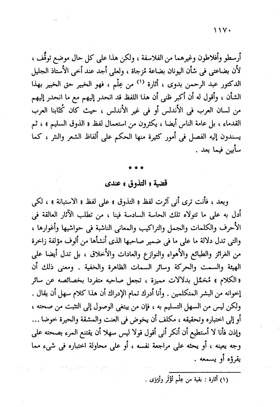 أرسطو وأفلاطون وغيرهما من الفلاسفة، ولكن هذا على كل حال موضع توقُّف، لأن بضاعتى في شأن اليونان بضاعة مُزجاة، ولعلى أجد عند أخي الأستاذ الجليل الدكتور عبد الرحمن بدوي، أثارة (¬1) من عِلْم، فهو الخبير حق الخبير بهذا الشأن، وأقول له أن أكبر ظني أن هذا اللفظ قد انحدر إليهم مع ما انحدر إليهم من لسان العرب في الأندلس أو في غير الأندلس، حيث كان كُتابنا العرب القدماء، بل عامة الناس أيضًا، يكثرون من استعمال لفظ "الذوق السليم"، ثم يسندون إليه الفصل في أمور كثيرة منها الحكم على ألفاظ الشعر والنثر، كما سأبين فيما بعد.