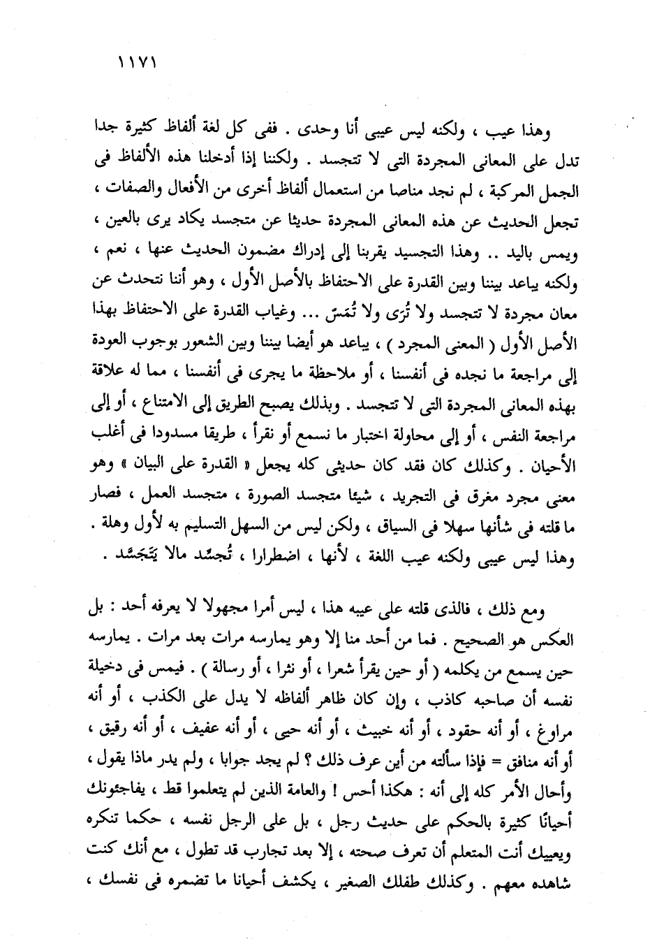 وهذا عيب، ولكنه ليس عيبي أنا وحدي. ففي كل لغة ألفاظ كثيرة جدًا تدل على المعاني المجردة التي لا تتجسد. ولكننا إذا أدخلنا هذه الألفاظ في الجمل المركبة، لم نجد مناصا من استعمال ألفاظ أخرى من الأفعال والصفات، تجعل الحديث عن هذه المعاني المجردة حديثا عن متجسد يكاد يرى بالعين، ويمس باليد .. وهذا التجسيد يقربنا إلى إدراك مضمون الحديث عنها، نعم، ولكنه يباعد بيننا وبين القدرة على الاحتفاظ بالأصل الأول، وهو أننا نتحدث عن معان مجردة لا تتجسد ولا تُرَى ولا تُمَسّ. . . وغياب القدرة على الاحتفاظ بهذا الأصل الأول (المعنى المجرد)، يباعد هو أيضًا بيننا وبين الشعور بوجوب العودة إلى مراجعة ما نجده في أنفسنا، أو ملاحظة ما يجرى في أنفسنا، مما له علاقة بهذه المعاني المجردة التي لا تتجسد. وبذلك يصبح الطريق إلى الامتناع، أو إلى مراجعة النفس، أو إلى محاولة اختبار ما نسمع أو نقرأ، طريقا مسدودا في أغلب الأحيان. وكذلك كان فقد كان حديثي كله يجعل "القدرة على البيان" وهو معنى مجرد مغرق في التجريد، شيئًا متجسد الصورة، متجسد العمل، فصار ما قلته في شأنها سهلا في السياق، ولكن ليس من السهل التسليم به لأول وهلة. وهذا ليس عيبى ولكنه عيب اللغة، لأنها، اضطرارا، تُجسد ما لا يَتَجَسَّد.