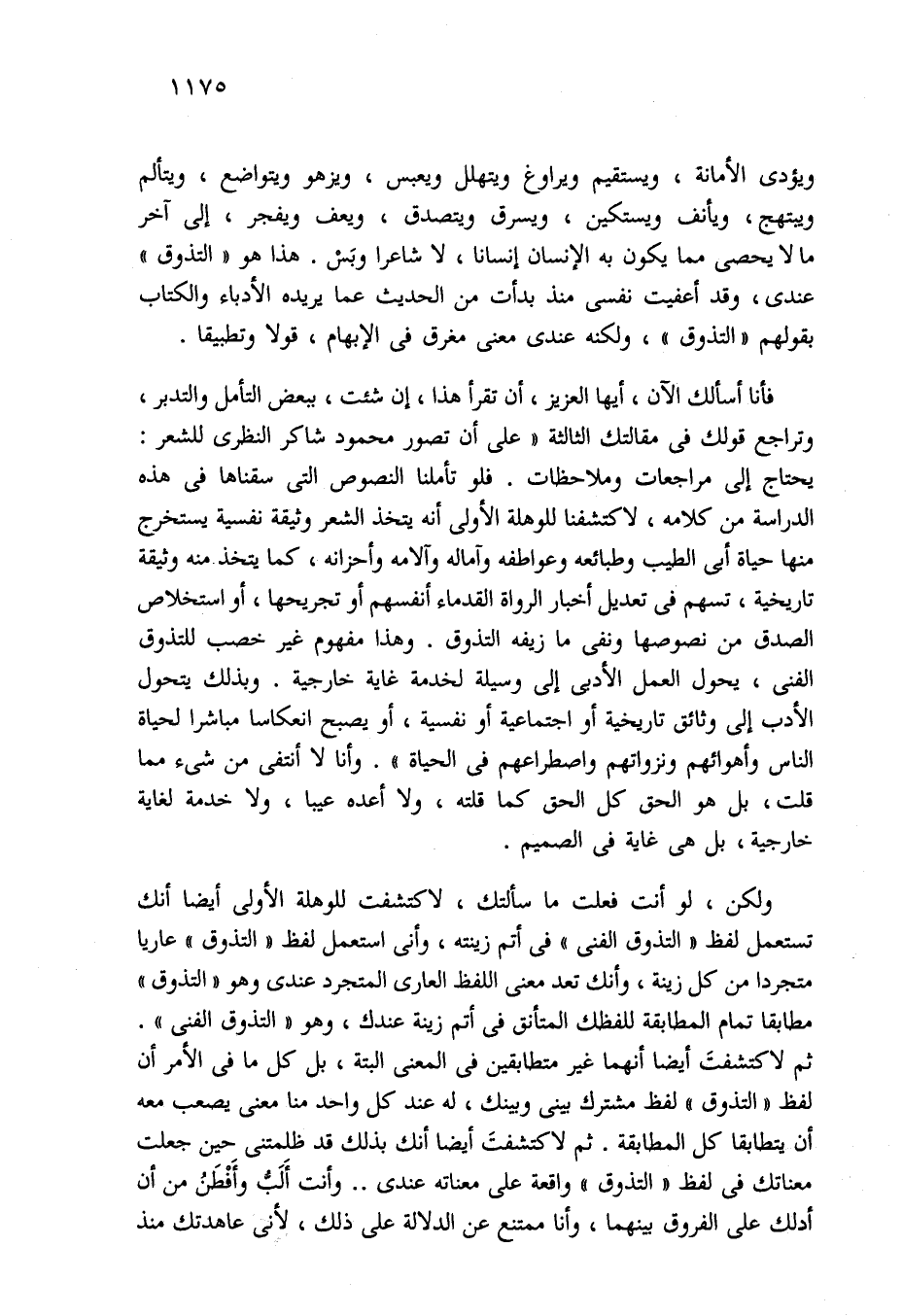ويؤدي الأمانة، ويستقيم ويراوغ ويتهلل ويعبس، ويزهو ويتواضع، ويتألم ويبتهج، ويأنف ويستكين، ويسرق ويتصدق، ويعف ويفجر، إلى آخر ما لا يحصى مما يكون به الإنسان إنسانا، لا شاعرًا وبَس. هذا هو "التذوق" عندي، وقد أعفيت نفسي منذ بدأت من الحديث عما يريده الأدباء والكتاب بقولهم "التذوق"، ولكنه عندي معنى مغرق في الإبهام، قولا وتطبيقا.