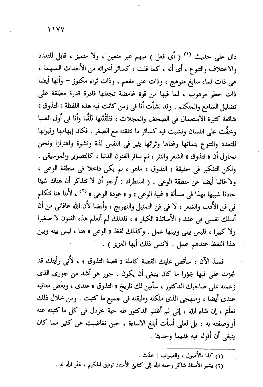 دال على حديث (¬1) (أي فعل) مبهم غير متعين، ولا متميز، قابل للتعدد والاختلاف والتنوع، أي أنه، كما قلت، كسائر أخواته من الأحداث المبهمة، هي ذات نماء سابغ متوهج، وذات غنى مفعم، وذات ثراء مكنوز -وأنها أيضًا ذات خطر مرهوب، لما فيها من قوة غامضة تجعلها قادرة قدرة مطلقة على تضليل السامع والمتكلم. وقد نشأت أنا في زمن كانت فيه هذه اللفظة "التذوق" شائعة كثيرة الاستعمال في الصحف والمجلات، فتَلَقَّنْتها تَلَقنا وأنا في أول الصبا وخفت على اللسان ونشبت فيه كسائر ما نتلقنه مع الصغر. فكان إبهامها وقبولها للتعدد والتنوع بنمائها وغناها وثرائها يثير في النفس لذة ونشوة واهتزازا ونحن نحاول أن "نتذوق" الشعر والنثر، ثم سائر الفنون الدنيا، كالتصوير والموسيقى. ولكن التفكير في حقيقة "التذوق" ما هو، لم يكن داخلا في منطقة الوعى، ولا غائبا أيضًا عن منطقة الوعى. (استطراد: أرجو أن لا تتذكر أن هناك شيئًا حادثا شبيها بهذا في مسألة "غيبة الوعى" و"عودة الوعى" (¬2)، لأننا هنا نتكلم في فن الأدب والشعر، لا في فن التمثيل والتهريج، وأيضا لأن الله عافانى من أن أسلك نفسي في عقد "الأساتذة الكبار"، فلذلك لم أتعلم هذه الفنون لا صغيرا ولا كبيرا، فليس بيني وبينها عمل. وكذلك لفظ "الوعى" هنا، ليس بينه وبين هذا اللفظ عندهم عمل. لا تنس ذلك أيها العزيز).