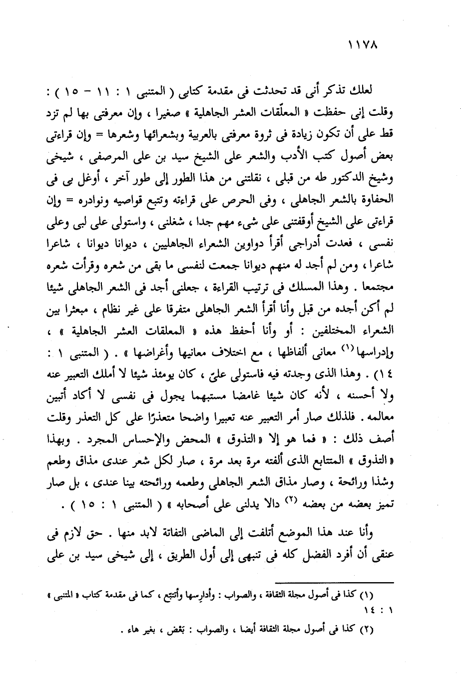 لعلك تذكر أنى قد تحدثت في مقدمة كتابى (المتنبي 1: 11 - 15): وقلت إني حفظت "المعلّقات العشر الجاهلية" صغيرا، وإن معرفتى بها لم تزد قط على أن تكون زيادة في ثروة معرفتى بالعربية وبشعرائها وشعرها = وإن قراءتى بعض أصول كتب الأدب والشعر على الشيخ سيد بن علي المرصفي، شيخى وشيخ الدكتور طه من قبلى، نقلتنى من هذا الطور إلى طور آخر، أوغل بي في الحفاوة بالشعر الجاهلي، وفي الحرص على قراءته وتتبع قواصيه ونوادره = وإن قراءتى على الشيخ أوقفتنى على شيء مهم جدًا، شغلنى، واستولى على لبى وعلى نفسي، فعدت أدراجى أقرأ دواوين الشعراء الجاهليين، ديوانا ديوانا، شاعرا شاعرا، ومن لم أجد له منهم ديوانا جمعت لنفسي ما بقي من شعره وقرأت شعره مجتمعا. وهذا المسلك في ترتيب القراءة، جعلني أجد في الشعر الجاهلي شيئًا لم أكن أجده من قبل وأنا أقرأ الشعر الجاهلي متفرقا على غير نظام، مبعثرا بين الشعراء المختلفين: أو وأنا أحفظ هذه "المعلقات العشر الجاهلية"، وإدراسها (¬1) معاني ألفاظها، مع اختلاف معانيها وأغراضها". (المتنبي 1: 14). وهذا الذي وجدته فيه فاستولى عليّ، كان يومئذ شيئًا لا أملك التعبير عنه ولا أحسنه، لأنه كان شيئًا غامضا مستبهما يجول في نفسي لا أكاد أتبين معالمه. فلذلك صار أمر التعبير عنه تعبيرا واضحا متعذرًا على كل التعذر وقلت أصف ذلك: "فما هو إلا "التذوق" المحض والإحساس المجرد. وبهذا "التذوق" المتتابع الذي ألفته مرة بعد مرة، صار لكل شعر عندي مذاق وطعم وشذا ورائحة، وصار مذاق الشعر الجاهلي وطعمه ورائحته بينا عندي، بل صار يتميز بعضه من بعضه (¬2) دالا يدلنى على أصحابه" (المتنبي 1: 15).