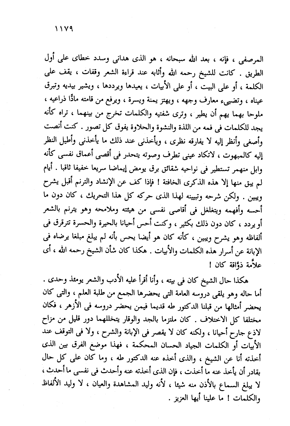 المرصفي، فإنه، بعد الله سبحانه، هو الذي هدانى وسدد خطاى على أول الطريق. كانت للشيخ -رحمه الله- وأثابه عند قراءة الشعر وقفات، يقف على الكلمة، أو على البيت، أو على الأبيات، يعيدها ويرددها، ويشير بيديه وتبرق عيناه، وتضيئ معارف وجهه، ويهتز يمنة ويسرة، ويرفع من قامته مادًا ذراعيه، ملوحا بهما يهم أن يطير، وترى شفتيه والكلمات تخرج من بينهما، تراه كأنه يجد للكلمات في فمه من اللذة والنشوة والحلاوة يفوق كل تصور. كنت أنصت وأصغى وأنظر إليه لا يفارقه نظرى، ويأخذنى عند ذلك ما يأخذنى وأطيل النظر إليه كالمبهوت، لا تكاد عيني تطرف وصوته يتحدر في أقصى أعماق نفسي كأنه وابل منهمر تستطير في نواحيه شقائق برق يومض إيماضا سريعا خفيفا ثاقبا. أيام لم يبق منها إلا هذه الذكرى الخافتة! فإذا كف عن الإنشاد والترنم أقبل يشرح ويبين. ولكن شرحه وتبيينه لهذا الذي حركه كل هذا التحريك، كان دون ما أحسه وأفهمه ويتغلغل في أقاصى نفسي من هيئته وملامحه وهو يترنم بالشعر أو يردد، كان دون ذلك بكثير، وكنت أحس أحيانا بالحيرة والحسرة تترقرق في ألفاظه وهو يشرح ويبين، كأنه كان هو أيضًا يحس بأنه لم يبلغ مبلغا يرضاه في الإبانة عن أسرار هذه الكلمات والأبيات. هكذا كان شأن الشيخ -رحمه الله-، أي علَّامة ذوَّاقة كان!