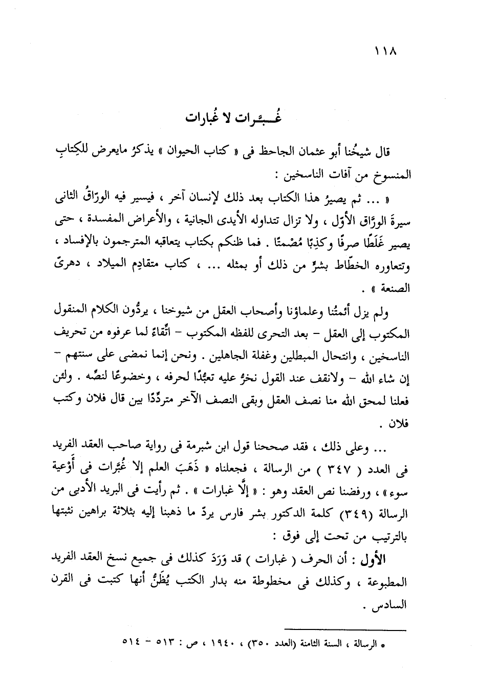 . . . وعلى ذلك، فقد صححنا قول ابن شبرمة في رواية صاحب العقد الفريد في العدد (347) من الرسالة، فجعلناه "ذَهَبَ العلم إلا غُبَّرات في أَوْعية سوء"، ورفضنا نص العقد وهو: "إلَّا غبارات". ثم رأيت في البريد الأدبى من الرسالة (349) كلمة الدكتور بشر فارس يردّ ما ذهبنا إليه بثلاثة براهين نثبتها بالترتيب من تحت إلى فوق: