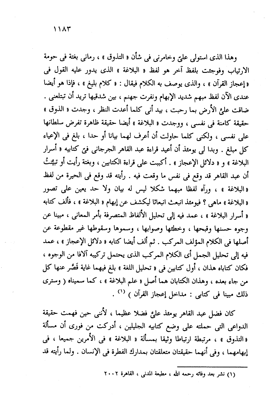 كان فضل عبد القاهر يومئذ عليَّ فضلا عظيما، لأننى حين فهمت حقيقة الدواعى التي حملته على وضع كتابيه الجليلين، أدركت من فورى أن مسألة "التذوق"، مرتبطة ارتباطا وثيقا بمسألة "البلاغة" في الأمرين جميعًا، في إبهامهما، وفي أنهما حقيقتان متعلقتان بمدارك الفطرة في الإنسان. ولما رأيته قد