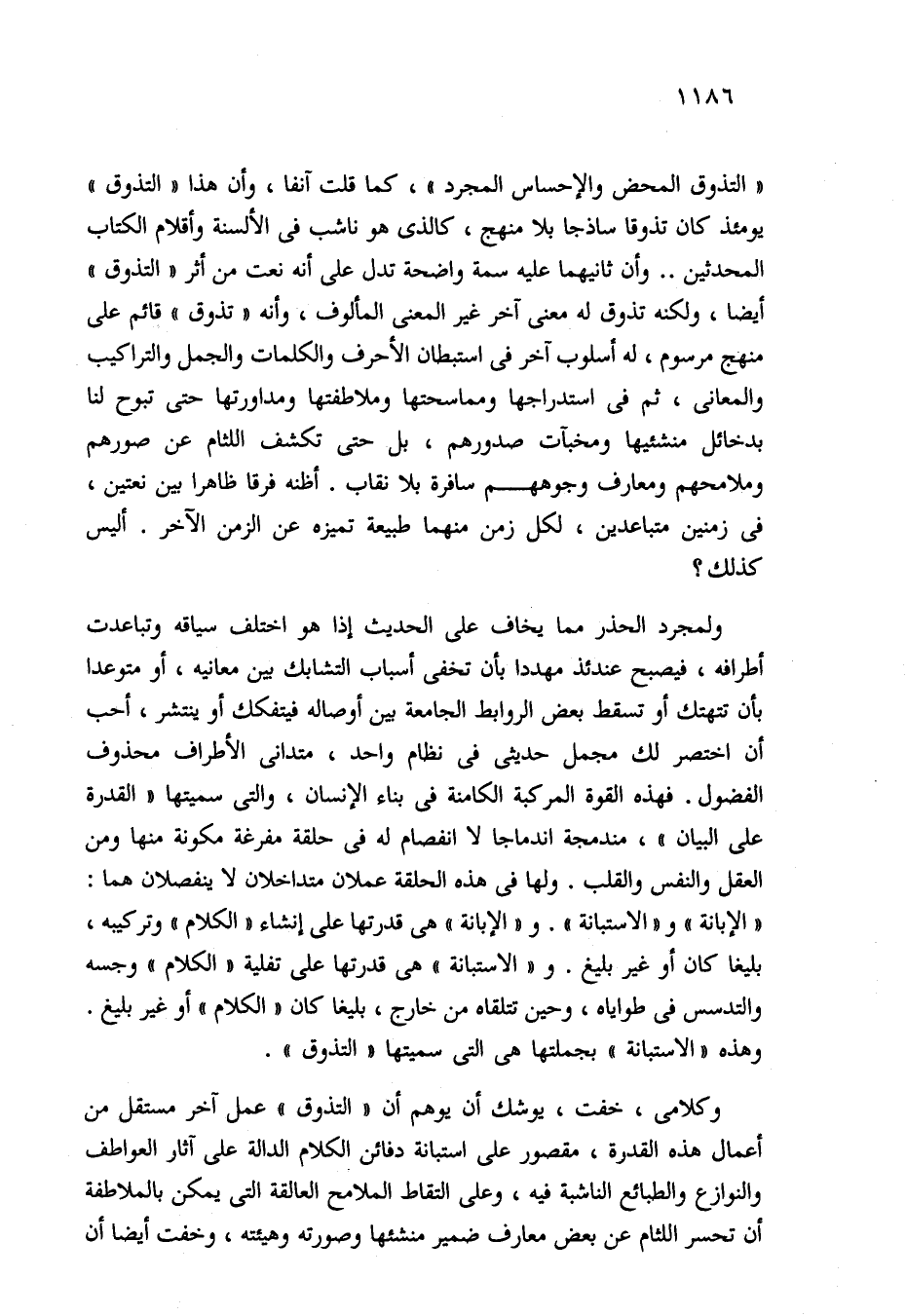 ولمجرد الحذر مما يخاف على الحديث إذا هو اختلف سياقه وتباعدت أطرافه، فيصبح عندئذ مهددا بأن تخفي أسباب التشابك بين معانيه، أو متوعدا بأن تتهتك أو تسقط بعض الروابط الجامعة بين أوصاله فيتفكك أو ينتشر، أحب أن أختصر لك مجمل حديثي في نظام واحد، متدانى الأطراف محذوف الفضول. فهذه القوة المركبة الكامنة في بناء الإنسان، والتي سميتها "القدرة على البيان"، مندمجة اندماجا لا انفصام له في حلقة مفرغة مكونة منها ومن العقل والنفس والقلب. ولها في هذه الحلقة عملان متداخلان لا ينفصلان هما: "الإبانة" و"الاستبانة" و"الإبانة" هي قدرتها على إنشاء "الكلام" وتركيبه، بليغا كان أو غير بليغ. و"الاستبانة" هي قدرتها على تفلية "الكلام" وجسه والتدسس في طواياه، وحين تتلقاه من خارج، بليغا كان "الكلام" أو غير بليغ. وهذه "الاستبانة" بجملتها هي التي سميتها "التذوق".