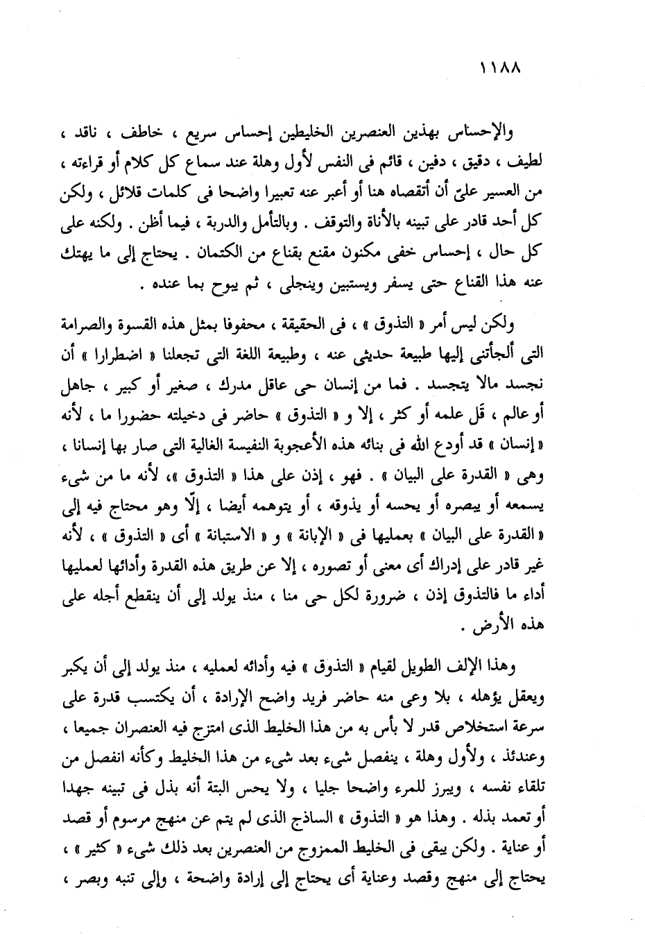 والإحساس بهذين العنصرين الخليطين إحساس سريع، خاطف، ناقد، لطيف، دقيق، دفين، قائم في النفس لأول وهلة عند سماع كل كلام أو قراءته، من العسير عليّ أن أتقصاه هنا أو أعبر عنه تعبيرا واضحا في كلمات قلائل، ولكن كل أحد قادر على تبينه بالأناة والتوقف. وبالتأمل والدربة، فيما أظن. ولكنه على كل حال، إحساس خفي مكنون مقنع بقناع من الكتمان. يحتاج إلى ما يهتك عنه هذا القناع حتى يسفر ويستبين وينجلى، ثمَّ يبوح بما عنده.