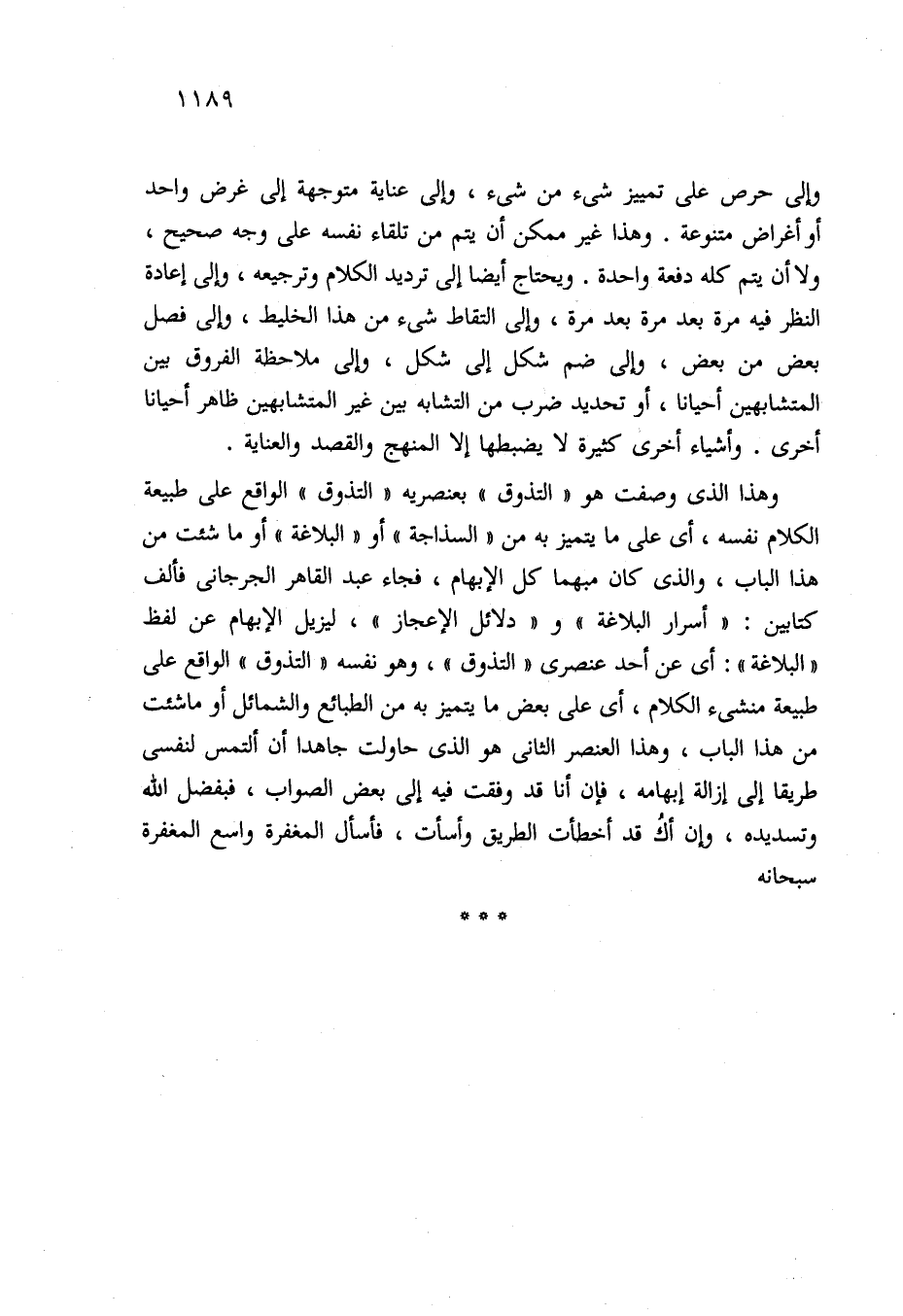 وهذا الذي وصفت هو "التذوق" بعنصريه "التذوق" الواقع على طبيعة الكلام نفسه، أي على ما يتميز به من "السذاجة" أو "البلاغة" أو ما شئت من هذا الباب، والذي كان مبهما كل الإبهام، فجاء عبد القاهر الجرجانى فألف كتابين: "أسرار البلاغة" و"دلائل الإعجاز"، ليزيل الإبهام عن لفظ "البلاغة": أي عن أحد عنصرى "التذوق"، وهو نفسه "التذوق" الواقع على طبيعة منشيء الكلام، أي على بعض ما يتميز به من الطبائع والشمائل أو ما شئت من هذا الباب، وهذا العنصر الثاني هو الذي حاولت جاهدا أن ألتمس لنفسي طريقا إلى إزالة إبهامه، فإن أنا قد وفقت فيه إلى بعض الصواب، فبفضل الله وتسديده، وإن أكُ قد أخطأت الطريق وأسأت، فأسأل المغفرة واسع المغفرة سبحانه.