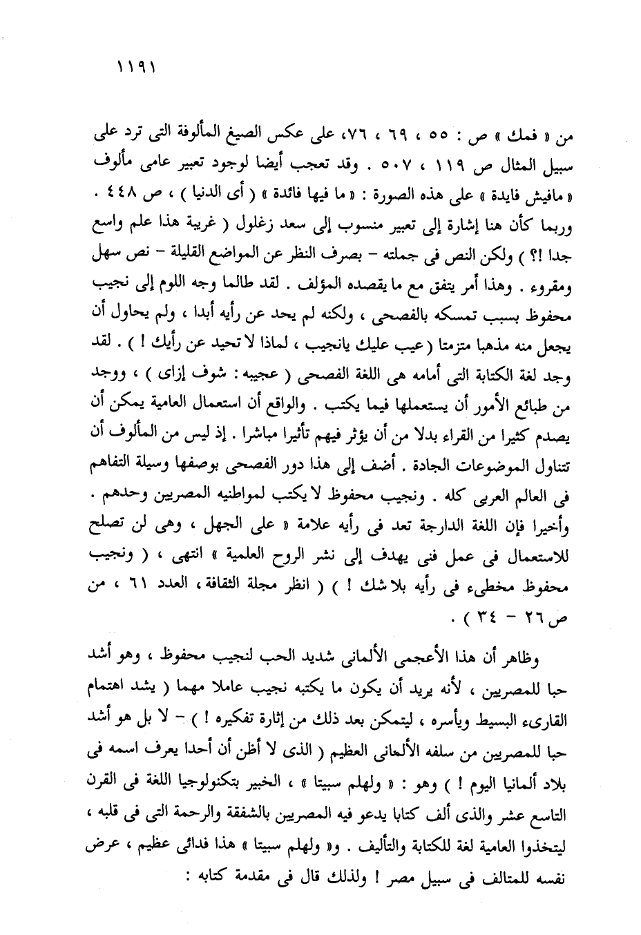 من "فمك" ص: 55، 69، 76، على عكس الصيغ المألوفة التي ترد على سبيل المثال ص 119، 507. وقد تعجب أيضًا لوجود تعبير عامى مألوف "مافيش فائدة" على هذه الصورة: "ما فيها فائدة" (أي الدنيا)، ص 448. وربما كأن هنا إشارة إلى تعبير منسوب إلى سعد زغلول (غريبة هذا علم واسع جدًا! ؟ ) ولكن النص في جملته -بصرف النظر عن المواضع القليلة- نص سهل ومقروء. وهذا أمر يتفق مع ما يقصده المؤلف. لقد طالما وجه اللوم إلى نجيب محفوظ بسبب تمسكه بالفصحى، ولكنه لم يحد عن رأيه أبدا، ولم يحاول أن يجعل منه مذهبا متزمتا (عيب عليك يا نجيب، لماذا لا تحيد عن رأيك! ). لقد وجد لغة الكتابة التي أمامه هي اللغة الفصحى (عجيبه: شوف إزاى)، ووجد من طبائع الأمور أن يستعملها فيما يكتب. والواقع أن استعمال العامية يمكن أن يصدم كثيرا من القراء بدلا من أن يؤثر فيهم تأثيرا مباشرا. إذ ليس من المألوف أن تتناول الموضوعات الجادة. أضف إلى هذا دور الفصحى بوصفها وسيلة التفاهم في العالم العربي كله. ونجيب محفوظ لا يكتب لمواطنيه المصريين وحدهم. وأخيرا فإن اللغة الدارجة تعد في رأيه علامة "على الجهل، وهي لن تصلح للاستعمال في عمل فني يهدف إلى نشر الروح العلمية" انتهى، (ونجيب محفوظ مخطئ في رأيه بلا شك! ) (انظر مجلة الثقافة، العدد 61، من ص 26 - 34).