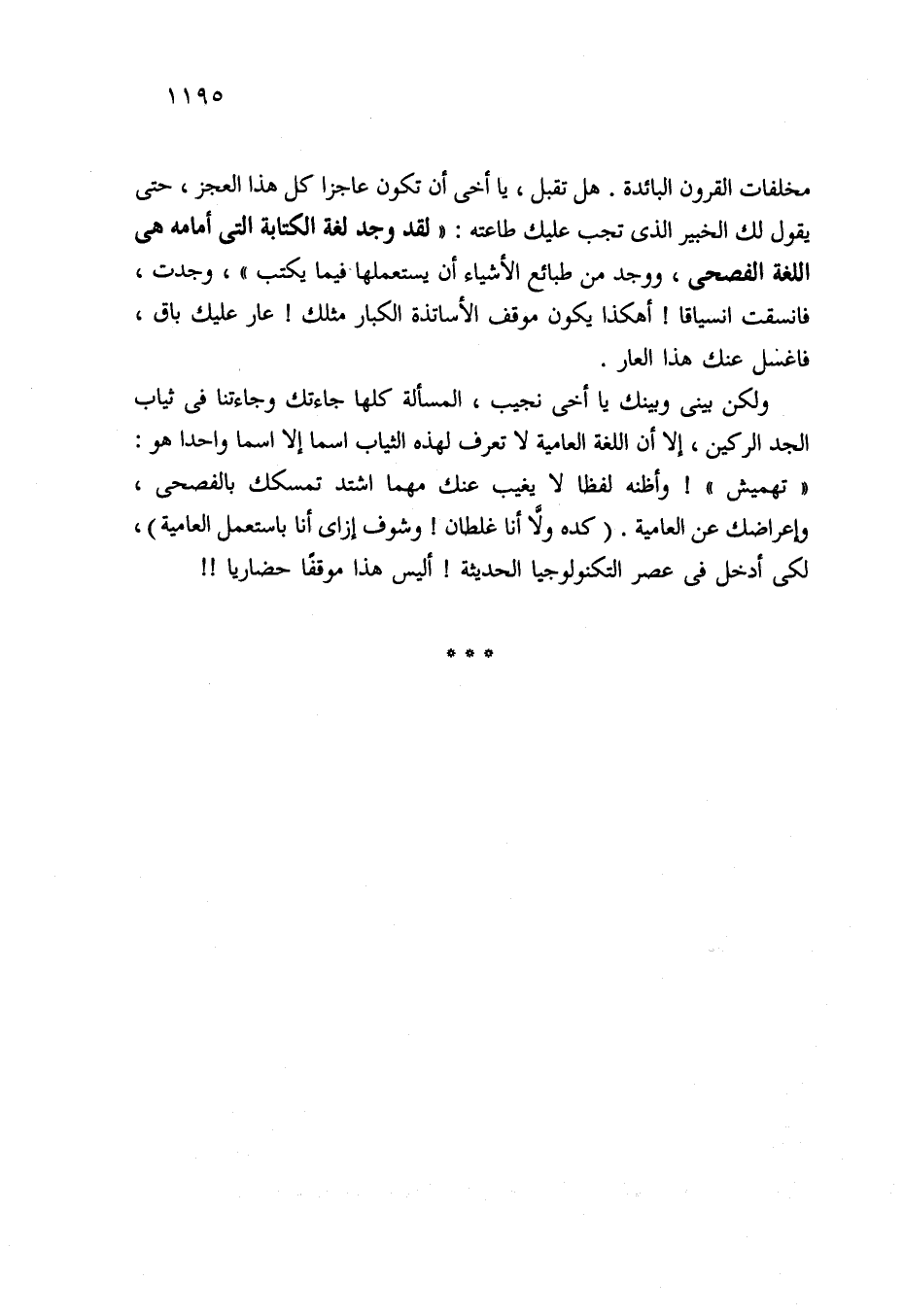 مخلفات القرون البائدة. هل تقبل، يا أخي أن تكون عاجزا كل هذا العجز، حتى يقول لك الخبير الذي تجب عليك طاعته: "لقد وجد لغة الكتابة التي أمامه هي اللغة الفصحي، ووجد من طبائع الأشياء أن يستعملها فيما يكتب"، وجدت، فانسقت انسياقا! أهكذا يكون موقف الأساتذة الكبار مثلك! عار عليك باق، فاغسل عنك هذا العار.