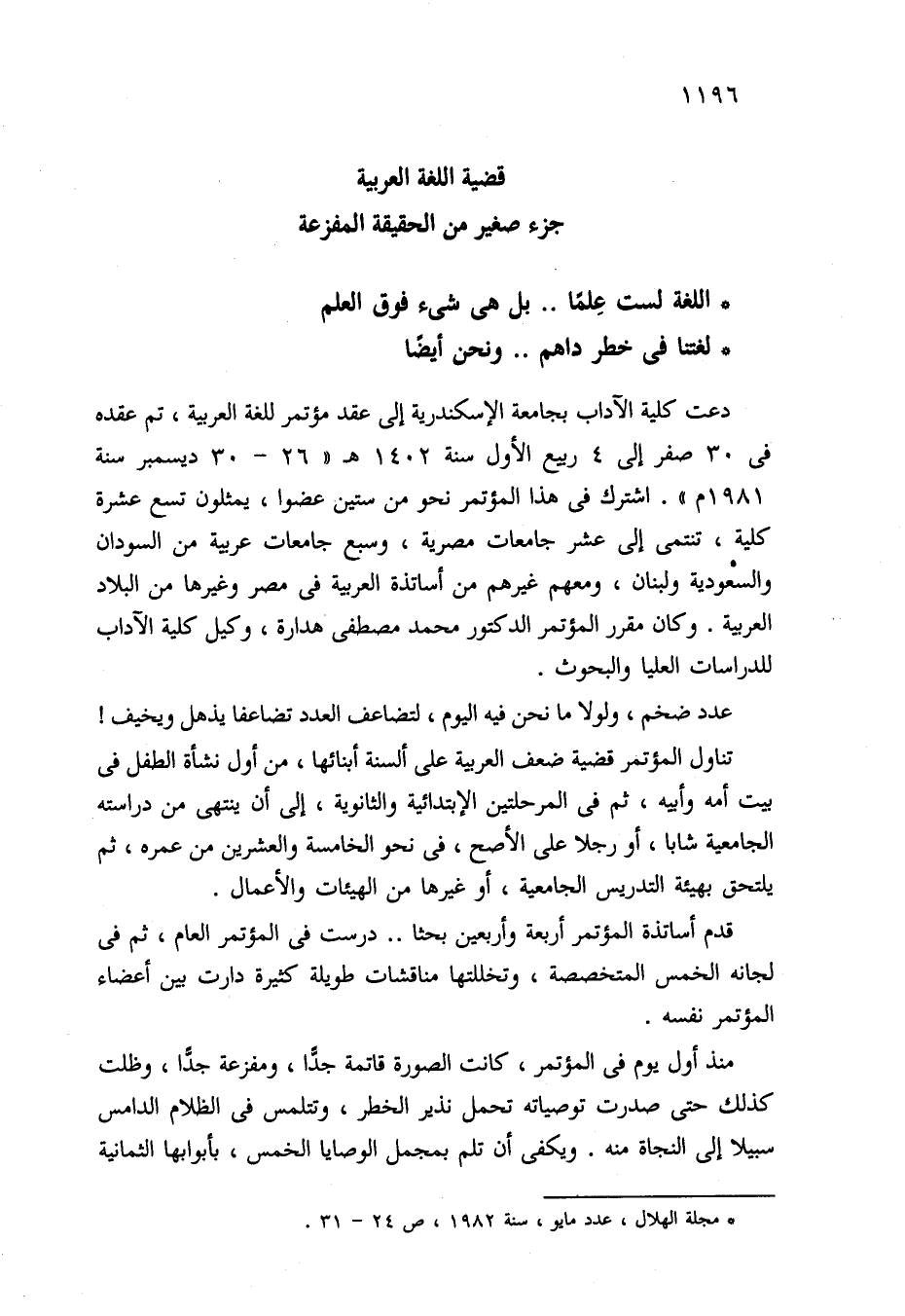 دعت كلية الآداب بجامعة الإسكندرية إلى عقد مؤتمر للغة العربية، تم عقده في 30 صفر إلى 4 ربيع الأول سنة 1402 هـ "26 - 30 ديسمبر سنة 1981 م". اشترك في هذا المؤتمر نحو من ستين عضوا، يمثلون تسع عشرة كلية، تنتمي إلى عشر جامعات مصرية، وسبع جامعات عربية من السودان والسعودية ولبنان، ومعهم غيرهم من أساتذة العربية في مصر وغيرها من البلاد العربية. وكان مقرر المؤتمر الدكتور محمد مصطفى هدارة، وكيل كلية الآداب للدراسات العليا والبحوث.