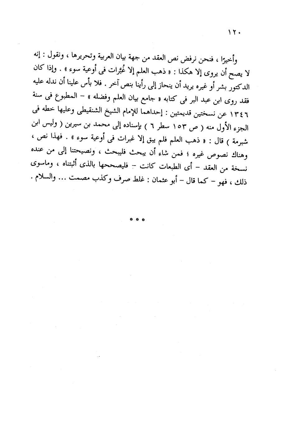 وأخيرًا، فنحن نرفض نص العقد من جهة بيان العربية وتحريرها، ونقول: إنه لا يصح أن يروى إلا هكذا: "ذهب العلم إلا غُبَّرات في أوعية سوء". وإذا كان الدكتور بشر أو غيره يريد أن ينحاز إلى رأينا بنص آخر. فلا بأس علينا أن ندله عليه فقد روى ابن عبد البر في كتابه "جامع بيان العلم وفضله" -المطبوع في سنة 1346 عن نسختين قديمتين: إحداهما للإمام الشيخ الشنقيطي وعليها خطه في الجزء الأول منه (ص 153 سطر 6) بإسناده إلى محمد بن سيرين (وليس ابن شبرمة) قال: "ذهب العلم فلم يبق إلا غبرات في أوعية سوء". فهذا نص، وهناك نصوص غيره؛ فمن شاء أن يبحث فليبحث، ونصيحتنا إلى من عنده نسخة من العقد -أي الطبعات كانت- فليصححها بالذي أثبتناه، وما سوى ذلك، فهو -كما قال- أبو عثمان: غلط صرف وكذب مصمت. . . والسلام.