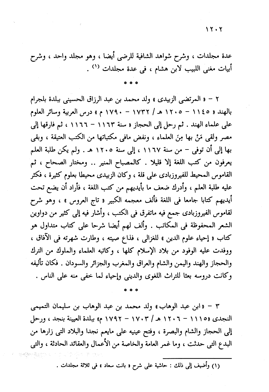 2 - "المرتضى الزبيدى" ولد محمد بن عبد الرزاق الحسينى ببلدة بلجرام بالهند "1145 - 1205 هـ/ 1732 - 1790 م" درس العربية وسائر العلوم على علماء الهند. ثم رحل إلى الحجاز "سنة 1163 - 1166، ثم فارقها إلى مصر ولقى مَنْ بها مِنَ العلماء، ونفض ما في مكتباتها من الكتب العتيقة، وبقي بها إلى أن توفي -من سنة 1167، إلى سنة 1205 هـ. ولم يكن طلبة العلم يعرفون من كتب اللغة إلا قليلًا. كالمصباح المنير .. ومختار الصحاح، ثم القاموس المحيط للفيروزبادى على قلة، وكان الزبيدى محيطا بعلوم كثيرة، فكثر عليه طلبة العلم، وأدرك ضعف ما بأيديهم من كتب اللغة، فأراد أن يضع تحت أيديهم كتابا جامعا في اللغة فألف معجمه الكبير "تاج العروس"، وهو شرح لقاموس الفيروزبادى جمع فيه ما تفرق في الكتب، وأشار فيه إلى كثير من دواوين الشعر المحفوظة في المكاتب. وألف لهم أيضًا شرحا على كتاب متداول هو كتاب "إحياء علوم الدين" للغزالى، فذاع صيته، وطارت شهرته في الآفاق، ووفدت عليه الوفود من بلاد الإسلام كلها، وكاتبه العلماء والملوك من الترك والحجاز والهند واليمن والشام والعراق والمغرب والجزائر والسودان. فكان تأليفه وكانت دروسه بعثا للتراث اللغوى والدينى وإحياء لما خفي منه على الناس.
