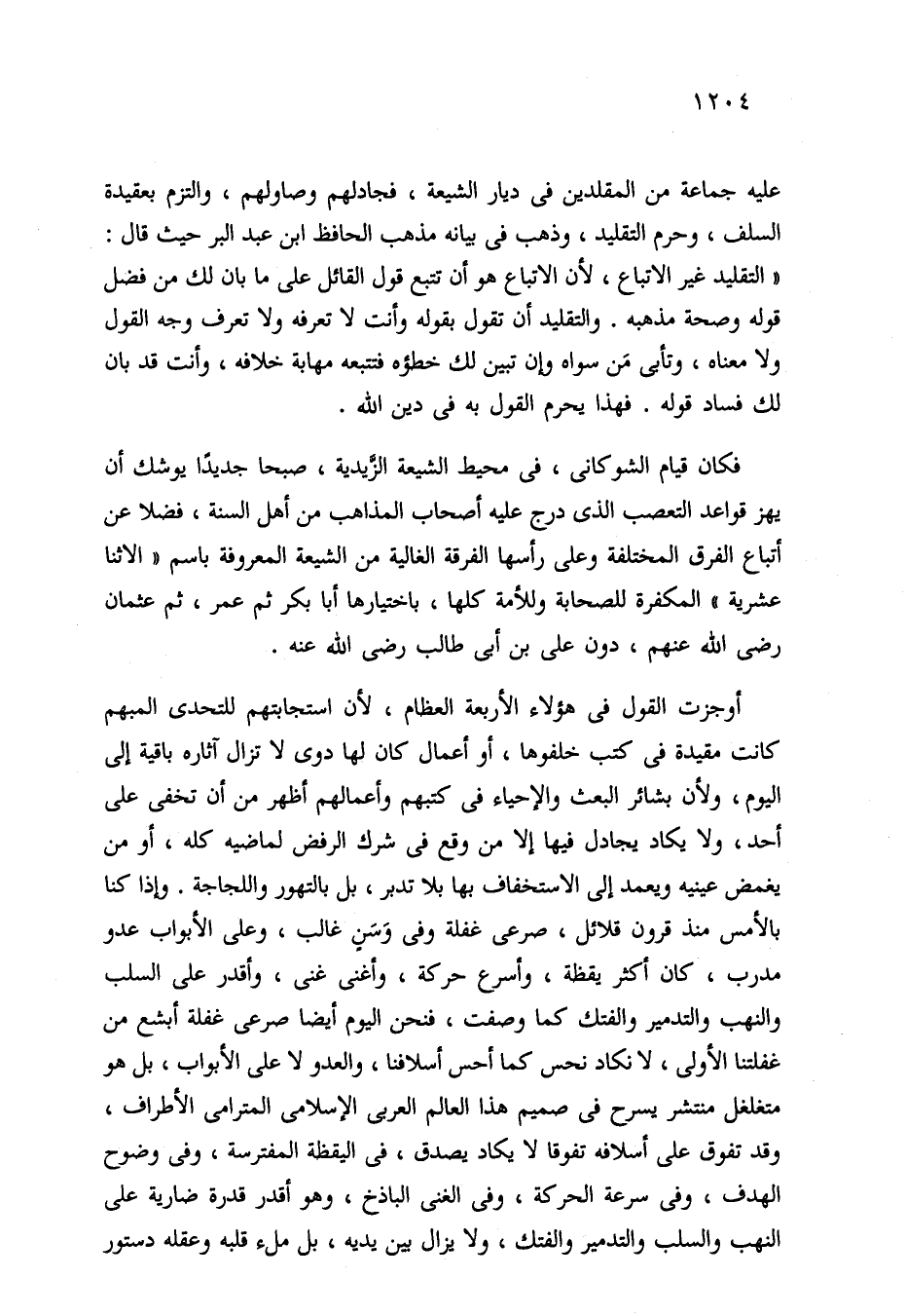 فكان قيام الشوكانى، في محيط الشيعة الزَّيدية، صبحا جديدًا يوشك أن يهز قواعد التعصب الذي درج عليه أصحاب المذاهب من أهل السنة، فضلا عن أتباع الفرق المختلفة وعلى رأسها الفرقة الغالية من الشيعة المعروفة باسم "الاثنا عشرية" المكفرة للصحابة وللأمة كلها، باختيارها أبا بكر ثم عمر، ثم عثمان -رضي الله عنهم-، دون علي بن أبي طالب - رضي الله عنه -.