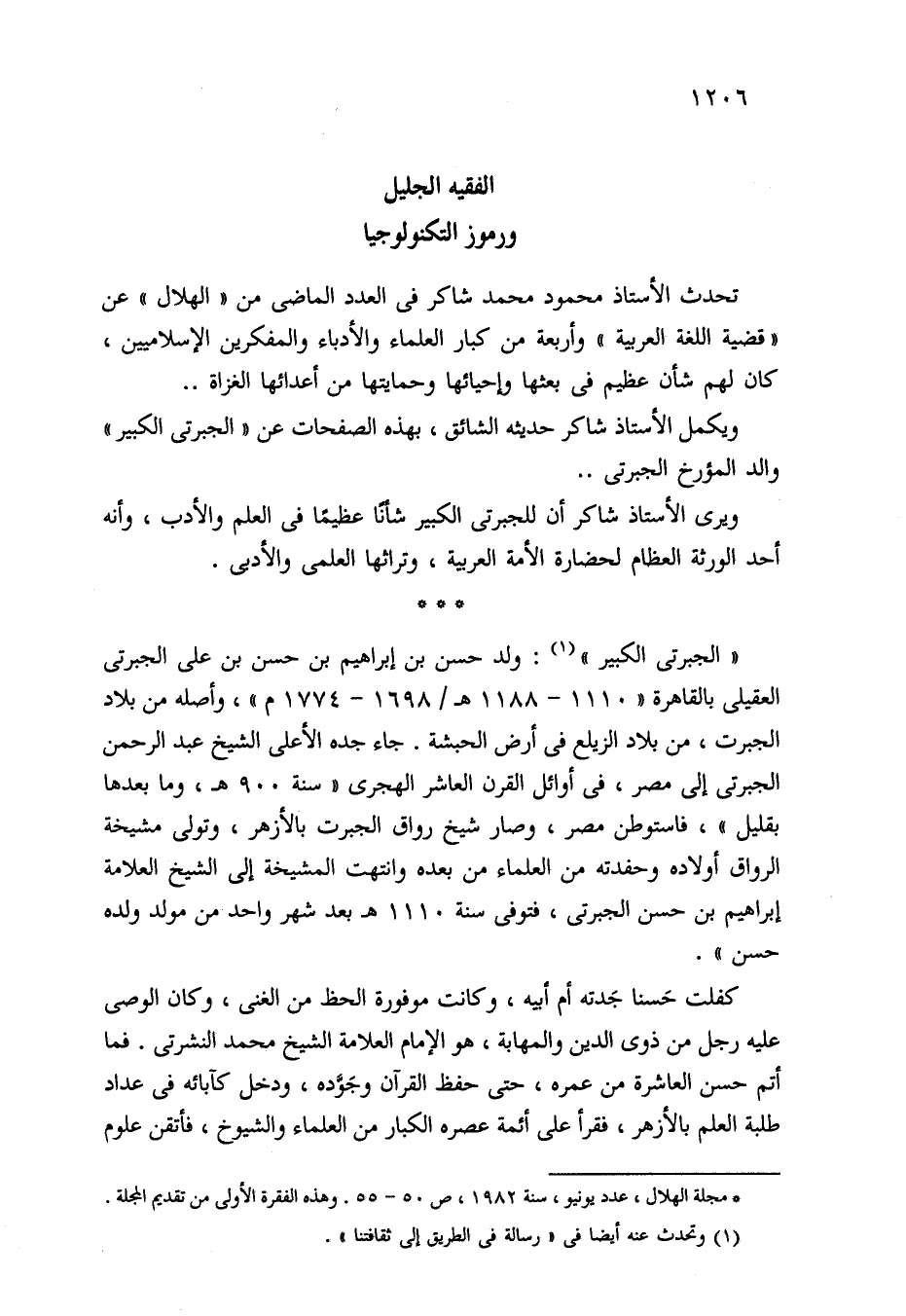 ويكمل الأستاذ شاكر حديثه الشائق، بهذه الصفحات عن "الجبرتى الكبير" والد المؤرخ الجبرتى ..