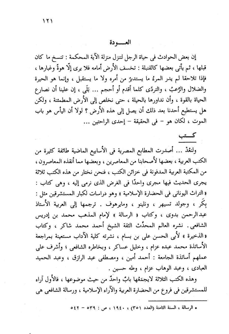 ولنعُدْ. . . أصدرت المطابع المصرية في الأسابيع الماضية طائفة كثيرة من الكتب العربية، بعضها لأصحابنا من المعاصرين، وبعضها مما أنقذه المعاصرون، من المكتبة العربية المدفونة في خزائن الكتب، فنحن نختار من هذه الكتب ثلاثة يجرى الحديث فيها مجرى واحدًا في الغرض الذي نرمى إليه، وهي كتاب: "التراث اليوناني في الحضارة الإسلامية" وهو دراسات لكبار المستشرقين مثل: بِكَر، وجولد تسيهر، ونلينو، ومايرهوف. ترجمها إلى العربية الأستاذ عبد الرحمن بدوي، وكتاب "الرسالة" لإمام المذهب محمد بن إدريس الشافعي. نشره العالم المحدِّث الثقة الشيخ أحمد محمد شاكر، وكتاب "الذخيرة" لأبي الحسن علي بن بسام، نشرته كلية الآداب مستعينة بمراجعة الأساتذة محمد عبده عزام، وخليل عساكر، وبخاطره الشافعي؛ وأشرف على عملهم أساتذة الجامعة: أحمد أمين، ومصطفى عبد الرازق، وعبد الحميد العبادي، وعبد الوهاب عزام، وطه حسين.