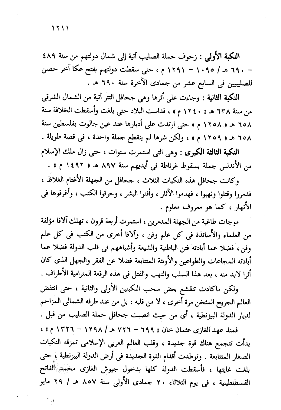وكانت جحافل هذه النكبات الثلاث، جحافل من الجهلة الأغتام الغلاظ، فدمروا وقتلوا ونهبوا، فهدموا الآثار، وأفنوا البشر، وحرقوا الكتب، وأغرقوها في الأنهار، كما هو معروف معلوم.