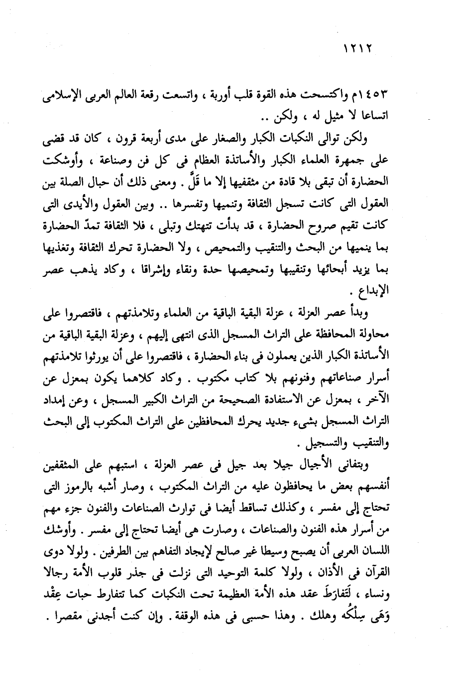 وبتفانى الأجيال جيلا بعد جيل في عصر العزلة، استبهم على المثقفين أنفسهم بعض ما يحافظون عليه من التراث المكتوب، وصار أشبه بالرموز التي تحتاج إلى مفسر، وكذلك تساقط أيضا في توارث الصناعات والفنون جزء مهم من أسرار هذه الفنون والصناعات، وصارت هي أيضا تحتاج إلى مفسر. وأوشك اللسان العربي أن يصبح وسيطا غير صالح لإيجاد التفاهم بين الطرفين. ولولا دوى القرآن في الأذان، ولولا كلمة التوحيد التي نزلت في جذر قلوب الأمة رجالا ونساء، لَتَفارَطَ عقد هذه الأمة العظيمة تحت النكبات كما تتفارط حبات عِقد وَهَى سِلْكُه وهلك. وهذا حسبى في هذه الوقفة. وإن كنت أجدني مقصرا.