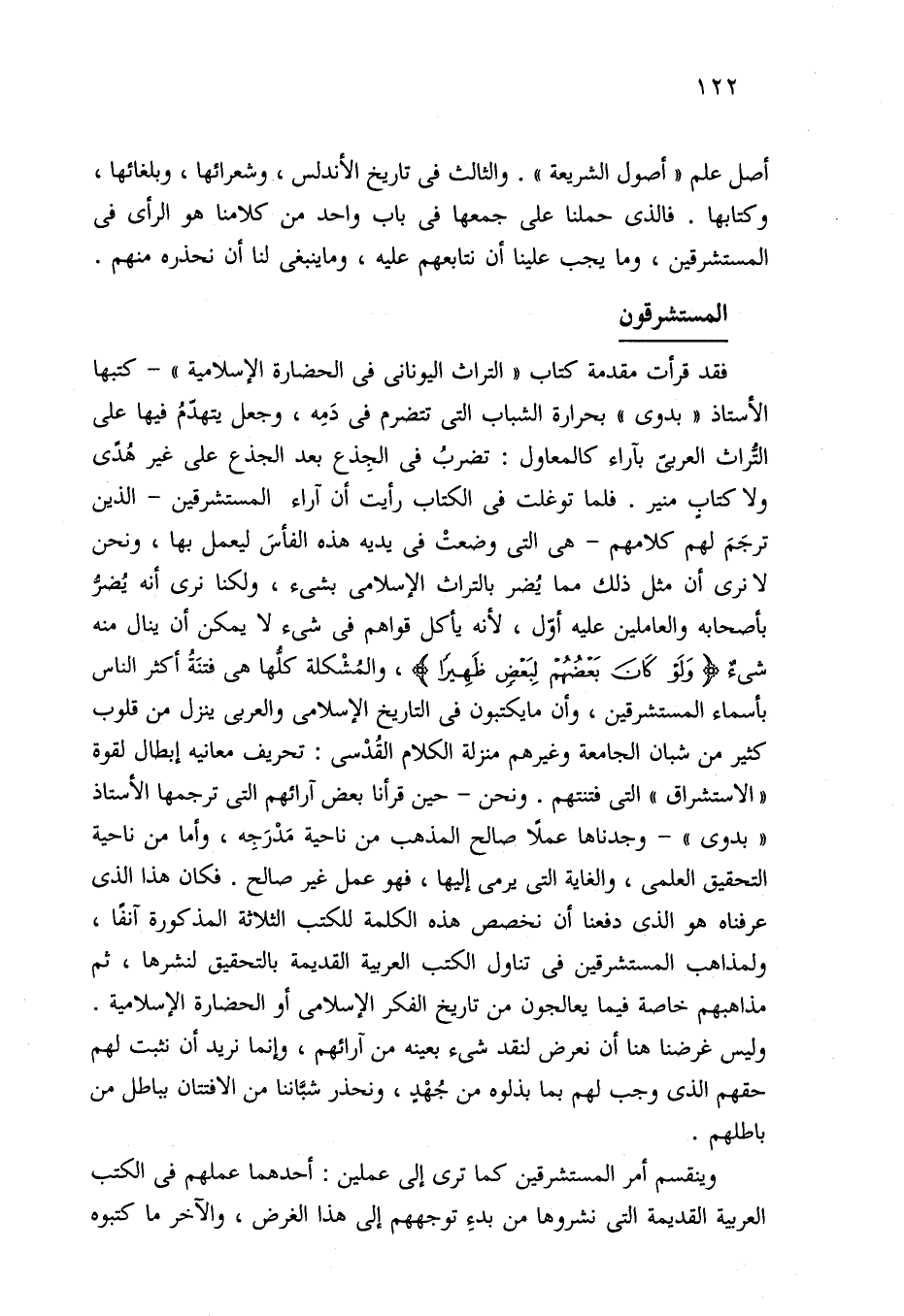 أصل علم "أصول الشريعة". والثالث في تاريخ الأندلس، وشعرائها، وبلغائها، وكتابها. فالذي حملنا على جمعها في باب واحد من كلامنا هو الرأي في المستشرقين، وما يجب علينا أن نتابعهم عليه، وما ينبغي لنا أن نحذره منهم.