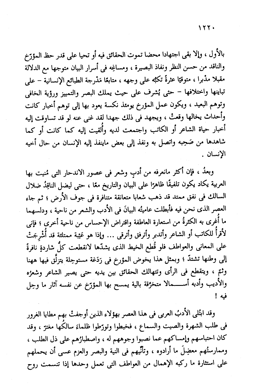 بالأول، وإلا بقى اجتهادا محضا تموت الحقائق فيه أو تحيا على قدر حظ المؤرّخ والناقد من حسن النظر ونفاذ البصيرة، ومساغِه في أسرار البيان متوجها مع الدلالة مقبلا مدبرا، متوقيًا عثرةً تكبُّه على وجهه، متابعًا مَدْرجة الطبائع الإنسانية -على تباينها واختلافها- حثى يُشرف على حيث يملك البصر والتمييز ورؤية الخافي وتوهم البعيد، ويكون عمل المؤرخ يومئذ نكسة يعود بها إلى توهم أخبار كانت وأحداث يخالها وقعتْ، ويجهد في ذلك جهدا لقد غني عنه لو قد تساوقت إليه أخبار حياة الشاعر أو الكاتب واجتمعت لديه وأُلقيت إليه كما كانت أو كما شاهدها من صَحِبه واتصل به ونفذ إلى بعض ما ينفذ إليه الإنسان من حال أخيه الإنسان.