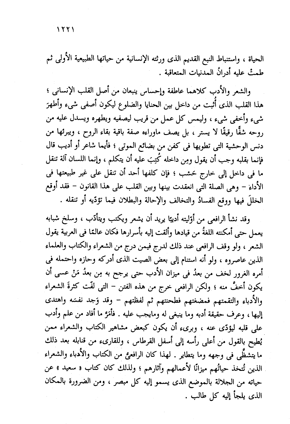 وقد نشأ الرافعي من أوّليته أديبًا يريد أن يشعر ويكتب ويتأدّب، وسلخ شبابه يعمل حتى أمكنته اللغةُ من قيادها وألقت إليه بأسرارها فكان عالمًا في العربية يقول الشعر، ولو وقف الرافعي عند ذلك لدرج فيمن درج من الشعراء والكتاب والعلماء الذين عاصروه، ولو أنه استنام إلى بعض الصيت الذي أدركه وحازه واحتمله في أمره الغرور لخف من بعدُ في ميزان الأدب حتى يرجح به مِن بعدُ مَنْ عسى أن يكون أخفَّ منه؛ ولكن الرافعي خرج من هذه الفتن -التي لفّت كثرةَ الشعراء والأدباء والتقمتهم فمضغتهم فطحنتهم ثم لفظتهم- وقد وَجد نفسَه واهتدى إليها، وعرف حقيقة أدبه وما ينبغي له وما يجب عليه. فأمَرَّ ما أفاد من علم وأدب على قلبه ليؤدّى عنه، وبرئ أن يكون كبعض مشاهير الكتاب والشعراء ممن يُطيح بالقول من أعلى رأسه إلى أسفل القرطاس، وللقارئ من قنابله بعد ذلك ما يتشظَّى في وجهه وما يتطاير. لهذا كان الرافعيُّ من الكتاب والأدباء والشعراء الذين تُتخذ حياتُهم ميزانًا لأعمالهم وآثارهم، ولذلك كان كتاب "سعيد" عن حياته من الجلالة بالموضع الذي يسمو إليه كل مبصر، ومن الضرورة بالمكان الذي يلجأ إليه كل طالب.