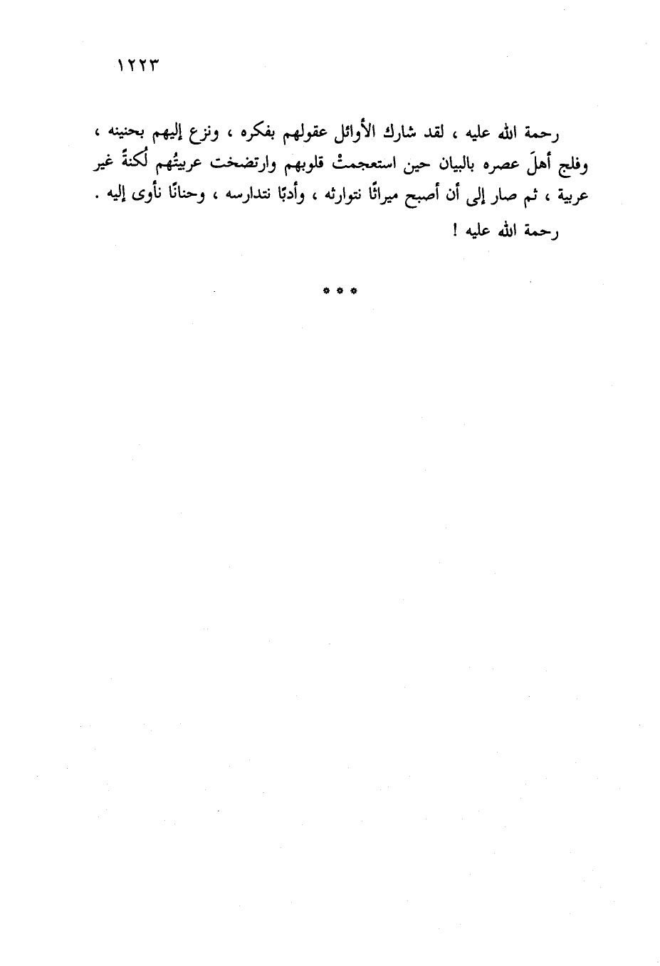 رحمة الله عليه، لقد شارك الأوائل عقولهم بفكره، ونزع إليهم بحنينه، وفلج أهلَ عصره بالبيان حين استعجمتْ قلوبهم وارتضخت عربيتُهم لُكنةً غير عربية، ثم صار إلى أن أصبح ميراثًا نتوارثه، وأدبًا نتدارسه، وحنانًا نأوى إليه. رحمة الله عليه!