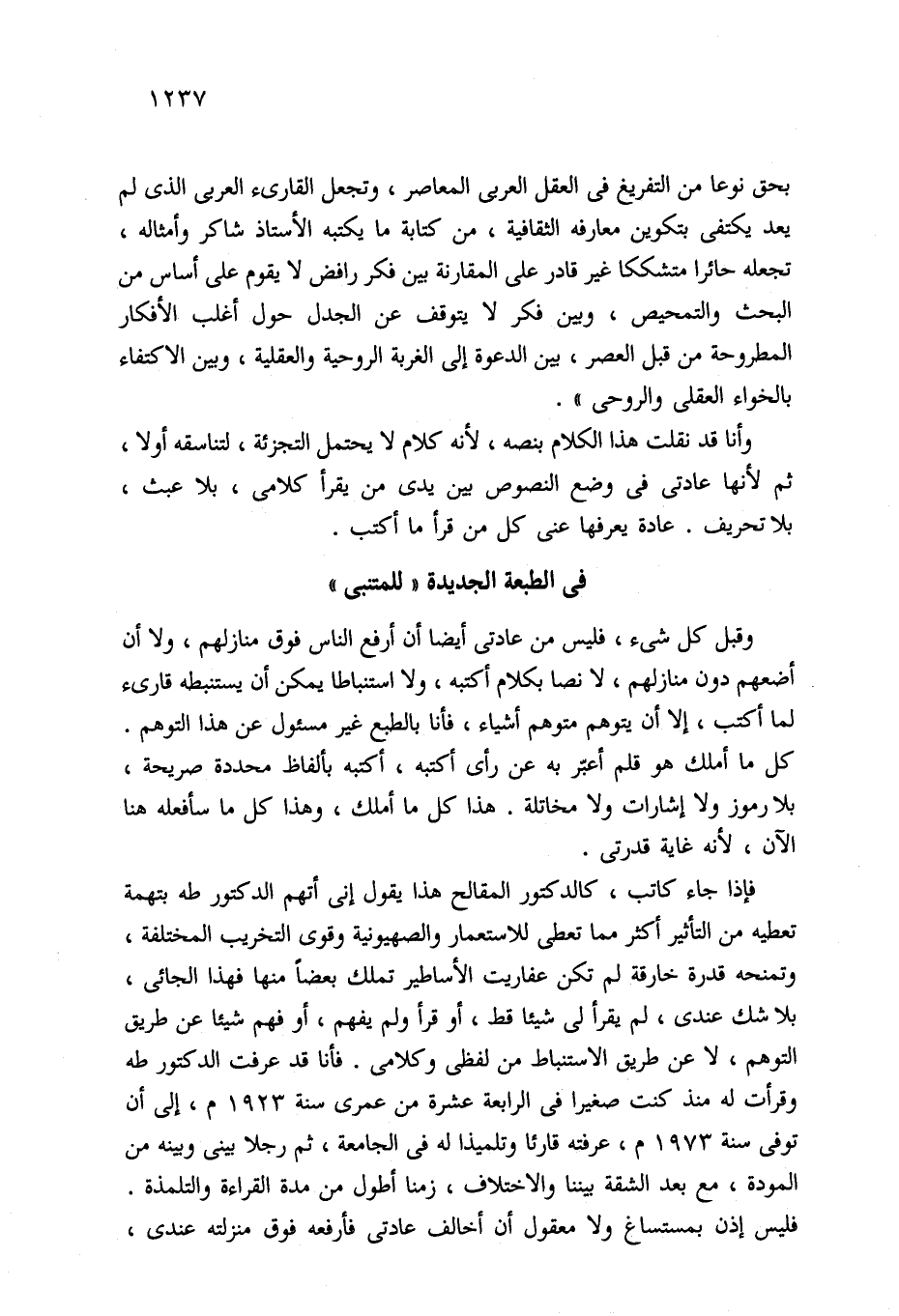 فإذا جاء كاتب، كالدكتور المقالح هذا يقول إني أتهم الدكتور طه بتهمة تعطيه من التأثير أكثر مما تعطى للاستعمار والصهيونية وقوى التخريب المختلفة، وتمنحه قدرة خارقة لم تكن عفاريت الأساطير تملك بعضًا منها فهذا الجائى، بلا شك عندي، لم يقرأ لي شيئا قط، أو قرأ ولم يفهم، أو فهم شيئا عن طريق التوهم، لا عن طريق الاستنباط من لفظى وكلامى. فأنا قد عرفت الدكتور طه وقرأت له منذ كنت صغيرا في الرابعة عشرة من عمرى سنة 1923 م، إلى أن توفي سنة 1973 م، عرفته قارئا وتلميذا له في الجامعة، ثم رجلا بيني وبينه من المودة، مع بعد الشقة بيننا والاختلاف، زمنا أطول من مدة القراءة والتلمذة. فليس إذن بمستساغ ولا معقول أن أخالف عادتى فأرفعه فوق منزلته عندي،