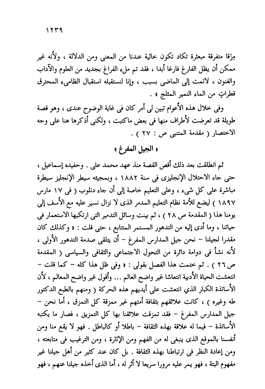ثم انطلقت بعد ذلك أقص القصة منذ عهد محمد على. وحفيده إسماعيل، حتى جاء الاحتلال الإنجليزي في سنة 1882، وبمجيئه سيطر الإنجليز سيطرة مباشرة على كل شيء، وعلى التعليم خاصة إلى أن جاء دنلوب (في 17 مارس 1897) ليضع للأمة نظام التعليم المدمر الذي لا نزال نسير عليه مع الأسف إلى يومنا هذا (المقدمة ص 28)، ثم بينت وسائل التدمير التي ارتكبها الاستعمار في حياتنا، وما أدى إليه من التدهور المستمر المتتابع، حتى قلت: "وكذلك كان مقدرا لجيلنا -نحن جيل المدارس المفرغ- أن يتلقى صدمة التدهور الأولى، لأنه نشأ في دوامة دائرة من التحول الاجتماعي والثقافي والسياسي (المقدمة ص 26). ثم ختمت هذا الفصل بقولى: "وفي ظل هذا كله -كما قلت- انتعشت الحياة الأدبية انتعاشا غير واضح العالم. . . وأقول غير واضح المعالم، لأن الأساتذة الكبار الذي انتعشت على أيديهم هذه الحركة (ومنهم بالطبع الدكتور طه وغيره)، كانت علائقهم بثقافة أمتهم غير ممزقة كل التمزق، أما نحن -جيل المدارس المفرغ- فقد تمزقت علائقنا بها كل التمزيق، فصار ما يكتبه الأساتذة -فيما له علاقة بهذه الثقافة- باطلا أو كالباطل. فهو لا يقع منا ومن أنفسنا بالموقع الذي ينبغي له من الفهم ومن الإثارة، ومن الترغيب في متابعته، ومن إعادة النظر في ارتباطنا بهذه الثقافة. بل كان عند كثير من أهل جيلنا غير مفهوم البتة، فهو يمر عليه مرورا سريعا لا أثر له، أما الذي أخذه جيلنا عنهم، فهو