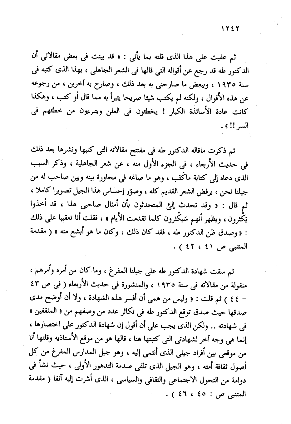 ثم عقبت على هذا الذي قلته بما يأتي: "قد بينت في بعض مقالاتى أن الدكتور طه قد رجع عن أقواله التي قالها في الشعر الجاهلي، بهذا الذي كتبه في سنة 1935، وببعض ما صارحنى به بعد ذلك، وصارح به آخرين، من رجوعه عن هذه الأقوال، ولكنه لم يكتب شيئا صريحا يتبرأ به مما قال أو كتب، وهكذا كانت عادة الأساتذة الكبار! يخطئون في العلن ويتبرءون من خطئهم في السر! ! ".