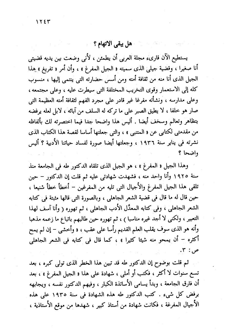 ثم قلت بوضوح إن الدكتور طه قد تبين هذا الخطر الذي تولى كبره، بعد تسع سنوات لا أكثر، فكتب أو أملى، شهادة على هذا "الجيل المفرغ"، بعد أن فارق الجامعة، وبدأ يسامى الأساتذة الكبار، وفيهم الدكتور نفسه، ويجابهه برفض كل شيء. كتب الدكتور طه هذه الشهادة في سنة 1935 على هذه الأجيال المفرغة، فكانت شهادة من أستاذ كبير، شهدها من موقع الأستاذية،