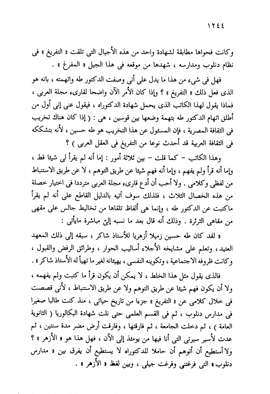 فهل في شيء من هذا ما يدل على أنى وصفت الدكتور طه واتهمته، بأنه هو الذي فعل ذلك "التفريغ"؟ وإذا كان الأمر الآن واضحا لقارئ مجلة العربي، فماذا يقول لهذا الكاتب الذي يحمل شهادة الدكتوراه، فيقول عني إني أول من أطلق اتهام الدكتور طه بتهمة وضعها بين قوسين، هي: (إذا كان هناك تخريب في الثقافة المصرية، فإن المسئول عن هذا التخريب هو طه حسين، لأنه بتشككه في الثقافة العربية قد أحدث نوعا من التفريغ في العقل العربي)؟