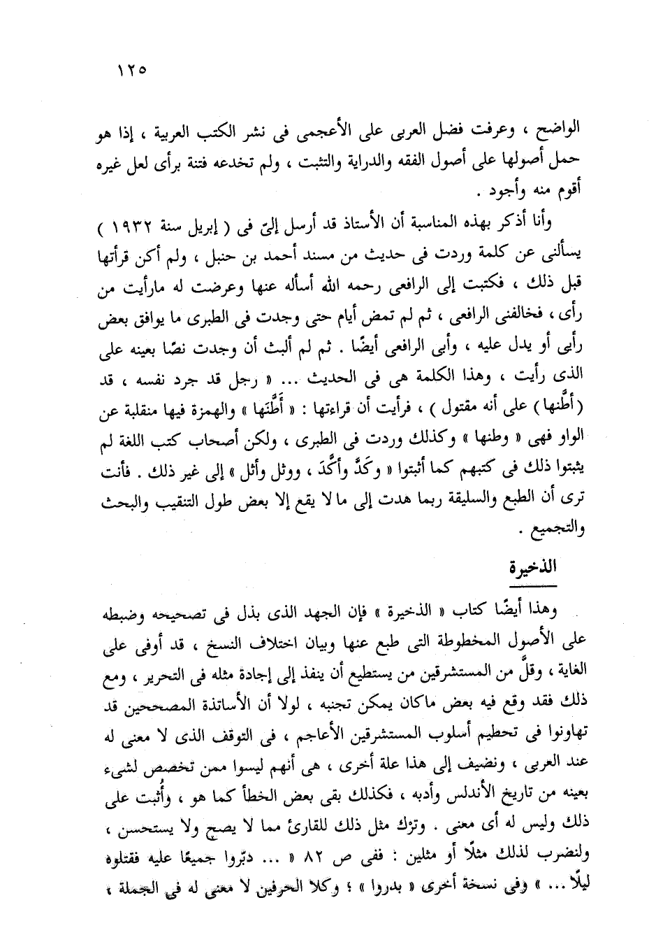 وهذا أيضًا كتاب "الذخيرة" فإن الجهد الذي بذل في تصحيحه وضبطه على الأصول المخطوطة التي طبع عنها وبيان اختلاف النسخ، قد أوفى على الغاية، وقلَّ من المستشرقين من يستطيع أن ينفذ إلى إجادة مثله في التحرير، ومع ذلك فقد وقع فيه بعض ما كان يمكن تجنبه، لولا أن الأساتذة المصححين قد تهاونوا في تحطيم أسلوب المستشرقين الأعاجم، في التوقف الذي لا معنى له عند العربي ونضيف إلى هذا علة أخرى، هي أنهم ليسوا ممن تخصص لشيء بعينه من تاريخ الأندلس وأدبه، فكذلك بقي بعض الخطأ كما هو، وأُثبت على ذلك وليس له أي معنى. وترْك مثل ذلك للقارئ مما لا يصح ولا يستحسن، ولنضرب لذلك مثلًا أو مثلين: ففي ص 82 ". . . . دبّروا جميعًا عليه فقتلوه ليلًا. . . ." وفي نسخة أخرى "بدروا"؛ وكلا الحرفين لا معنى له في الجملة،