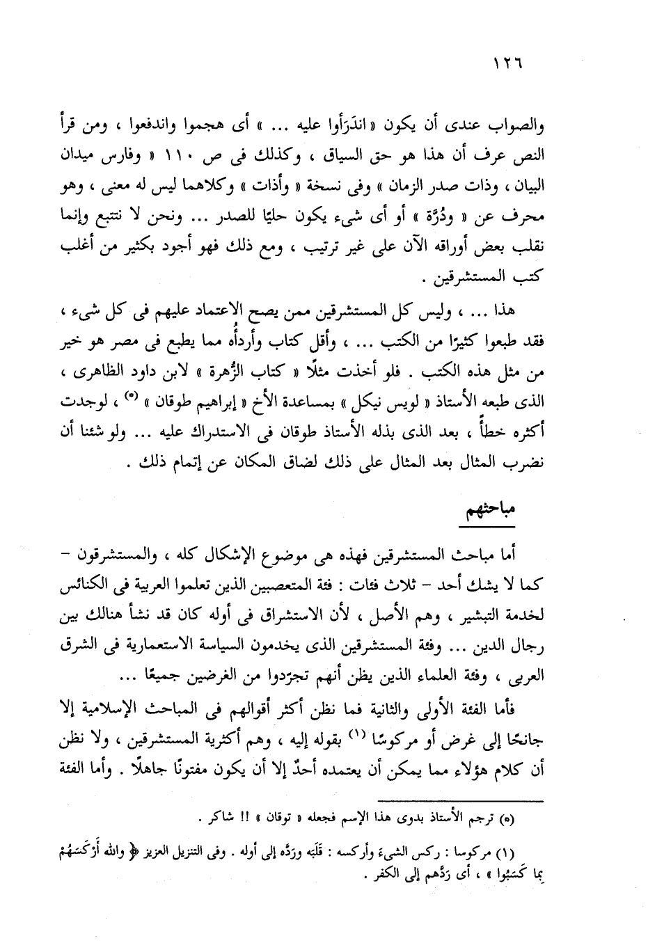 هذا. . .، وليس كل المستشرقين ممن يصح الاعتماد عليهم في كل شيء، فقد طبعوا كثيرًا من الكتب. . .، وأقل كتاب وأردأُه مما يطبع في مصر هو خير من مثل هذه الكتب. فلو أخذت مثلًا "كتاب الزُّهرة" لابن داود الظاهري، الذي طبعه الأستاذ "لويس نيكل" بمساعدة الأخ "إبراهيم طوقان" (*)، لوجدت أكثره خطأً، بعد الذي بذله الأستاذ طوقان في الاستدراك عليه. . . ولو شئنا أن نضرب المثال بعد المثال على ذلك لضاق المكان عن إتمام ذلك.
