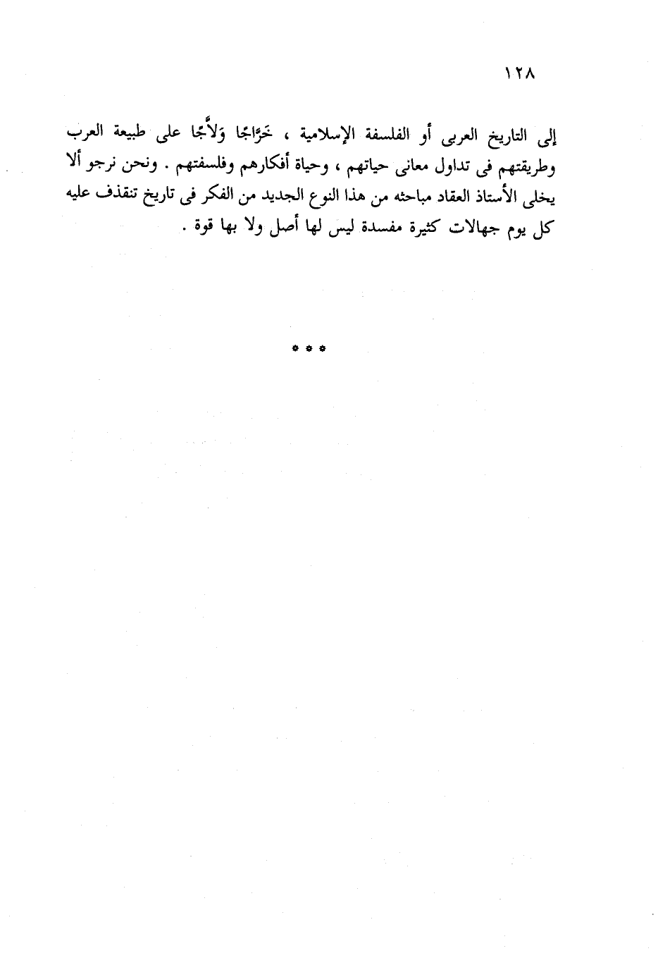 إلى التاريخ العربي أو الفلسفة الإسلامية، خَرَّاجًا وَلَّاجًا على طبيعة العرب وطريقتهم في تداول معاني حياتهم، وحياة أفكارهم وفلسفتهم. ونحن نرجو ألا يخلى الأستاذ العقاد مباحثه من هذا النوع الجديد من الفكر في تاريخ تنقذف عليه كل يوم جهالات كثيرة مفسدة ليس لها أصل ولا بها قوة.